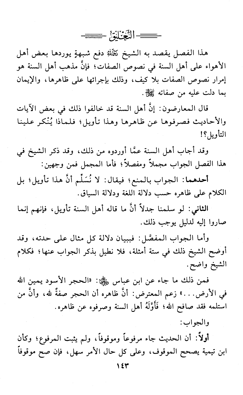 هذا الفصل يقصد به الشيخ – رحمه الله – دفع شبهةٍ يوردها بعض أهل الأهواء على أهل السنة في نصوص الصفات؛ فإنَّ مذهب أهل السنة هو إمرار نصوص الصفات بلا كيف، وذلك بإجرائها على ظاهرها، والإيمان بما دلت عليه من صفاته – سبحانه وتعالى –.