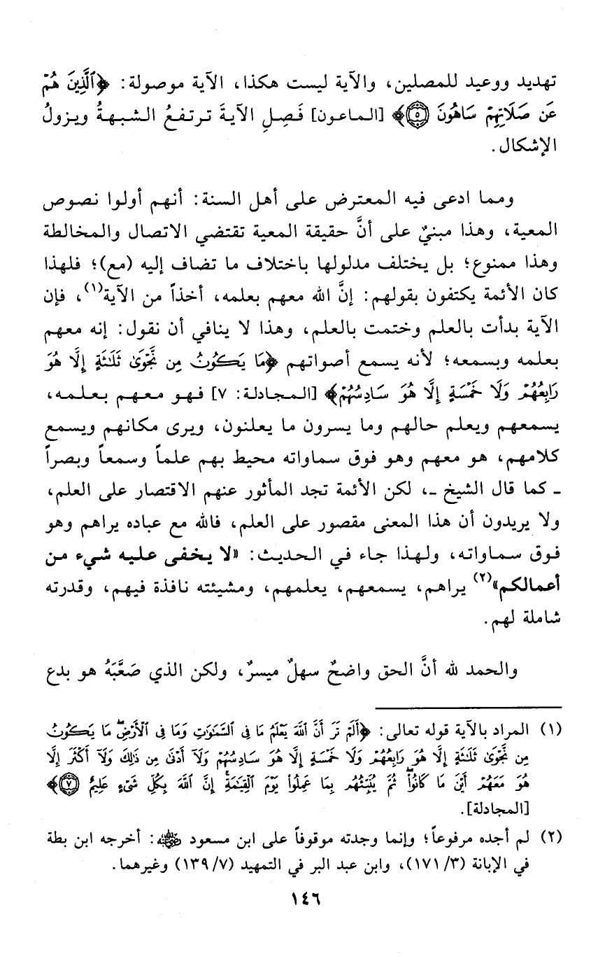 ومما ادعى فيه المعترض على أهل السنة: أنهم أولوا نصوص المعية، وهذا مبنيٌ على أنَّ حقيقة المعية تقتضي الاتصال والمخالطة وهذا ممنوع؛ بل يختلف مدلولها باختلاف ما تضاف إليه (مع)؛ فلهذا كان الأئمة يكتفون بقولهم: إنَّ الله معهم بعلمه , أخذًا من الآية (¬1) , فإن الآية بدأت بالعلم وختمت بالعلم , وهذا لا ينافي أن نقول: إنه معهم بعلمه وبسمعه، لأنه يسمع أصواتهم " ما يكون من نجوى ثلاثة إلا هو رابعهم ولا خمسة إلا هو سادسهم " [المجادلة: 7] فهو معهم بعلمه، يسمعهم ويعلم حالهم وما يسرون ما يعلنون , ويرى مكانهم ويسمع كلامهم , هو معهم وهو فوق سماواته محيط بهم علمًا وسمعًا وبصرًا – كما قال الشيخ – , لكن الأئمة تجد المأثور عنهم الاقتصار على العلم , ولا يريدون أن هذا المعنى مقصور على العلم , فالله مع عباده يراهم وهو فوق سماواته , ولهذا جاء في الحديث: " لا يخفى عليه شيء من أعمالكم " (¬2) يراهم، يسمعهم، يعلمهم، ومشيئته نافذة فيهم، وقدرته شاملة لهم.