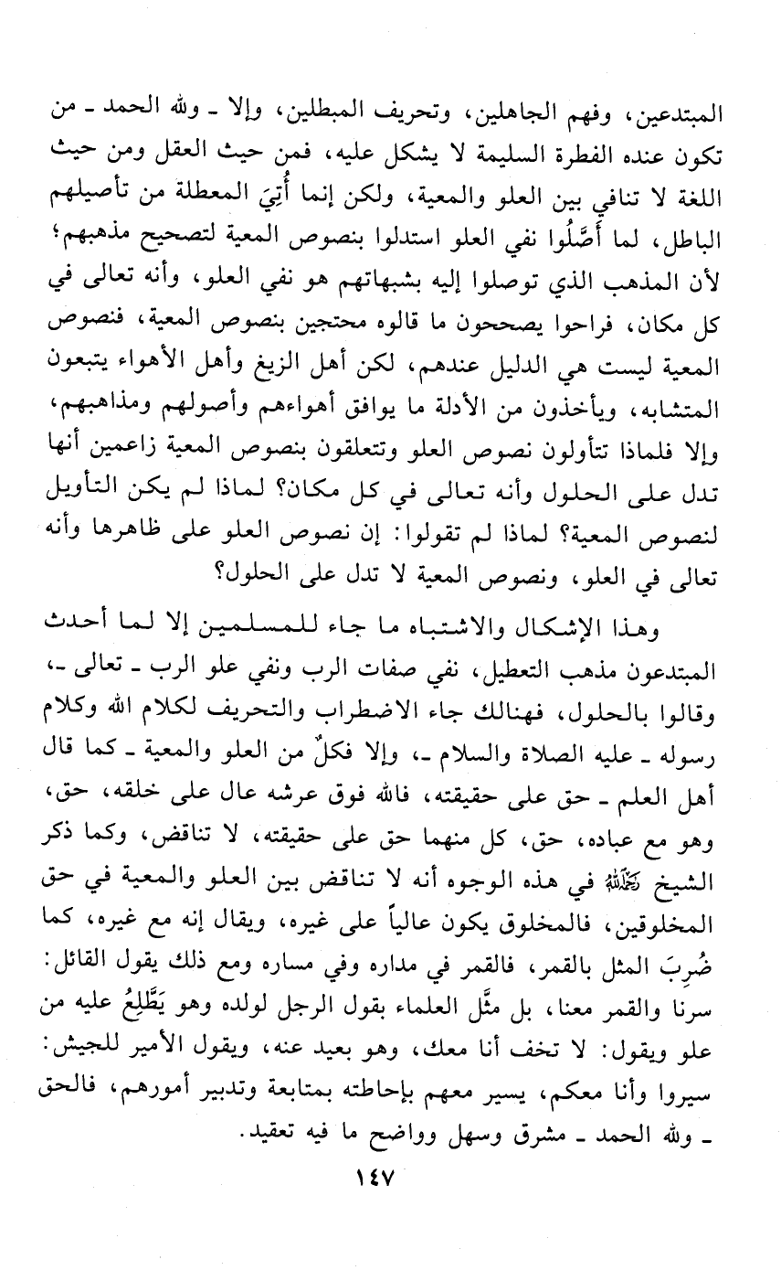 وهذا الإشكال والاشتباه ما جاء للمسلمين إلا لما أحدث المبتدعون مذهب التعطيل , نفي صفات الرب ونفي علو الرب – تعالى –، وقالوا بالحلول , فهنالك جاء الاضطراب والتحريف لكلام الله وكلام رسوله – عليه الصلاة والسلام – , وإلا فكلٌ من العلو والمعية – كما قال أهل العلم – حق على حقيقته , فالله فوق عرشه عال على خلقه , حق , وهو مع عباده , حق , كل منهما حق على حقيقته , لا تناقض , وكما ذكر الشيخ – رحمه الله – في هذه الوجوه أنه لا تناقض بين العلو والمعية في حق المخلوقين , فالمخلوق يكون عاليًا على غيره , ويقال إنه مع غيره , كما ضُرِبَ المثل بالقمر , فالقمر في مداره وفي مساره ومع ذلك يقول القائل: سرنا والقمر معنا , بل مثَّل العلماء بقول الرجل لولده وهو يَطَّلِعُ عليه من علو ويقول: لا تخف أنا معك , وهو بعيد عنه , ويقول الأمير للجيش: سيروا وأنا معكم , أسير معكم , بإحاطته بمتابعة وتدبير أمورهم , فالحق – ولله الحمد – مشرق وسهل وواضح ما فيه هذا التعقيد.