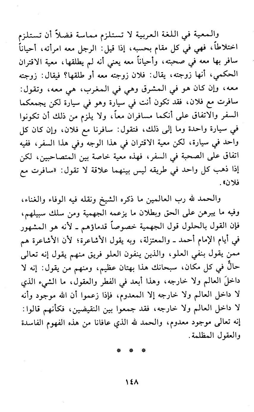 والمعية في اللغة العربية لا تستلزم مماسة فضلًا أن تستلزم اختلاطًا , فهي في كل مقام بحسبه , إذا قيل: الرجل معه امرأته , أحيانًا سافر بها معه في صحبته , وأحيانًا معه يعني أنه لم يطلقها , معية الاقتران الحكمي , أنها زوجته , يقال: فلان زوجته معه أو طلقها؟ فيقال: زوجته معه , وإن كان هو في المشرق وهي في المغرب , هي معه , وتقول: سافرت مع فلان، فقد تكون أنت في سيارة وهو في سيارة لكن يجمعكما السفر والاتفاق على أنكما مسافران معًا , ولا يلزم من ذلك أن تكونوا في سيارة واحدة وما إلى ذلك , فتقول: سافرنا مع فلان، وإن كان كل واحد في سيارة , لكن معية الاقتران في هذا الوجه وفي هذا السفر , ففيه اتفاق على الصحبة في السفر , فهذه معية خاصة بين المتصاحبين , لكن إذا ذهب كل واحد في طريقه ليس بينهما علاقة لا تقول: (أنا سافرت مع فلان).