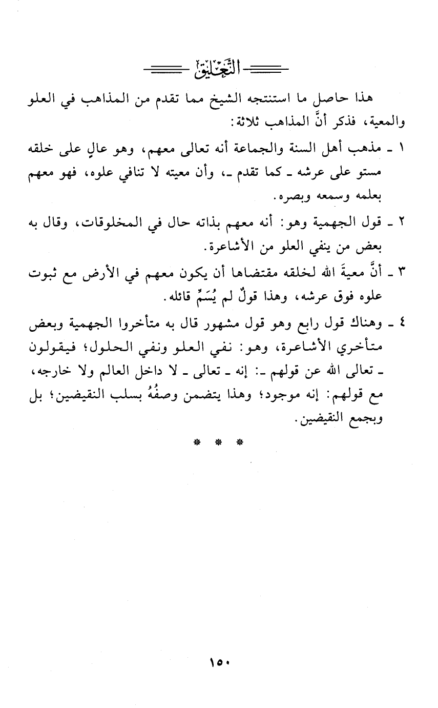 هذا حاصل ما استنتجه الشيخ مما تقدم من المذاهب في العلو والمعية، فذكر أنَّ المذاهب ثلاثة: