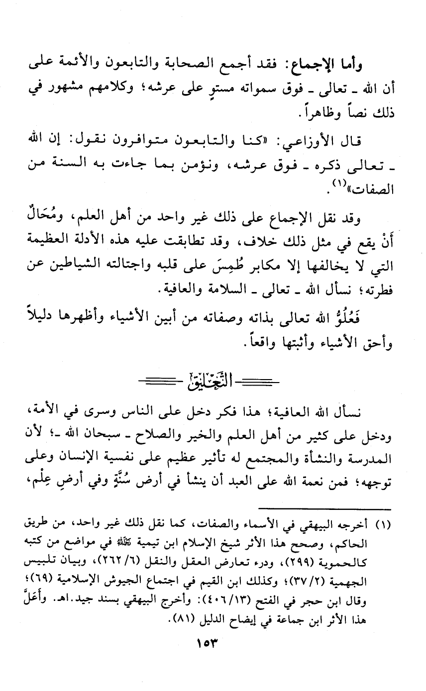 وأما الإجماع: فقد أجمع الصحابة والتابعون والأئمة على أن الله - تعالى - فوق سمواته مستوٍ على عرشه؛ وكلامهم مشهور في ذلك نصًا وظاهرًا.