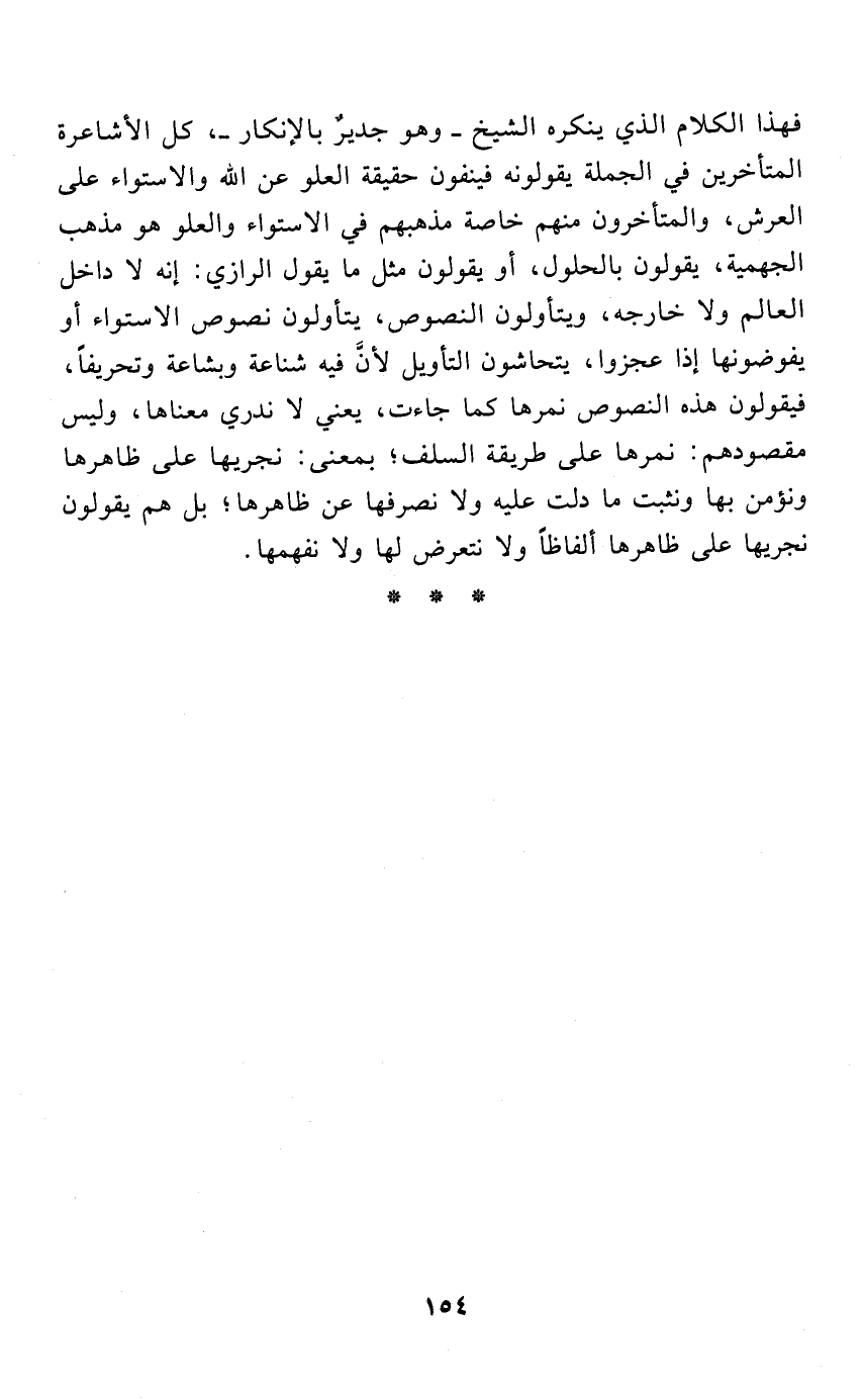 فهذا الكلام الذي يقوله الشيخ وينكره - وهو جديرٌ بالإنكار - , هذا كل الأشاعرة في الجملة - كما تقدم - ينفون حقيقة العلو عن الله والاستواء على العرش , والمتأخرون منهم خاصة مذهبهم في الاستواء والعلو هو مذهب الجهمية , يقولون بالحلول , أو يقولون مثل ما يقول الرازي: إنه لا داخل العالم ولا خارجه , ويتأولون النصوص , يتأولون نصوص الاستواء أو يفوضونها إذا عجزوا , يتحاشون التأويل لأنَّ فيه شناعة وبشاعة وتحريفًا، فيقولون هذه النصوص نمرها كما جاءت , يعني لا ندري معناها , وليس مقصودهم: نمرها على طريقة السلف؛ بمعنى: نجريها على ظاهرها ونؤمن بها ونثبت ما دلت عليه ولا نصرفها عن ظاهرها؛ بل هم يقولون نجريها على ظاهرها ألفاظًا ولا نتعرض لها ولا نفهمها.