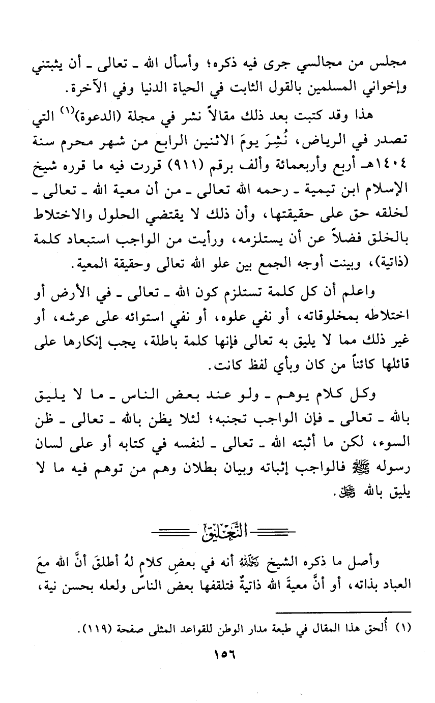 هذا وقد كتبت بعد ذلك مقالًا نشر في مجلة (الدعوة) (¬1) التي تصدر في الرياض، نُشِرَ يومَ الاثنين الرابع من شهر محرم سنة 1404 هـ أربع وأربعمائة وألف برقم (911) قررت فيه ما قرره شيخ الإسلام ابن تيمية - رحمه الله تعالى - من أن معية الله - تعالى - لخلقه حق على حقيقتها، وأن ذلك لا يقتضي الحلول والاختلاط بالخلق فضلًا عن أن يستلزمه، ورأيت من الواجب استبعاد كلمة (ذاتية)، وبينت أوجه الجمع بين علو الله تعالى وحقيقة المعية.