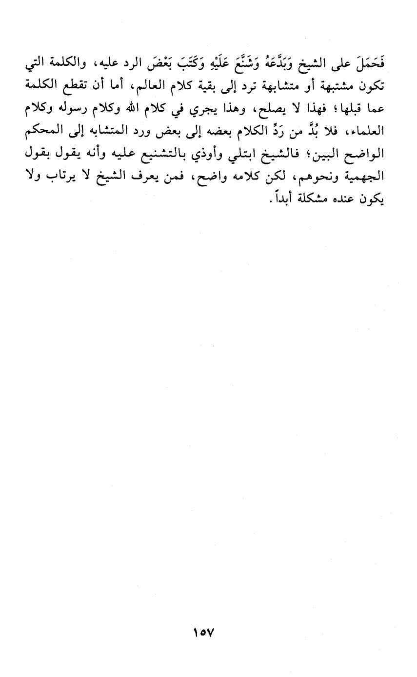 فَحَمَلَ على الشيخ وَبَدَّعَهُ وَشَنَّعَ عَلَيْهِ وَكَتَبَ بَعْضَ الرد عليه , والكلمة التي تكون مشتبهة أو متشابهة ترد إلى بقية كلام العالم , أما أن تقطع الكلمة عما قبلها!! فهذا لا يصلح، وهذا يجري في كلام الله وكلام رسوله وكلام العلماء , فلا بُدَّ من رَدِّ الكلام بعضه إلى بعض ورد المتشابه إلى المحكم الواضح البين؛ فالشيخ ابتلي وأوذي بالتشنيع عليه وأنه يقول بقول الجهمية ونحوهم , لكن كلامه واضح , فمن يعرف الشيخ لا يرتاب ولا يكون عنده مشكلة أبدًا.
