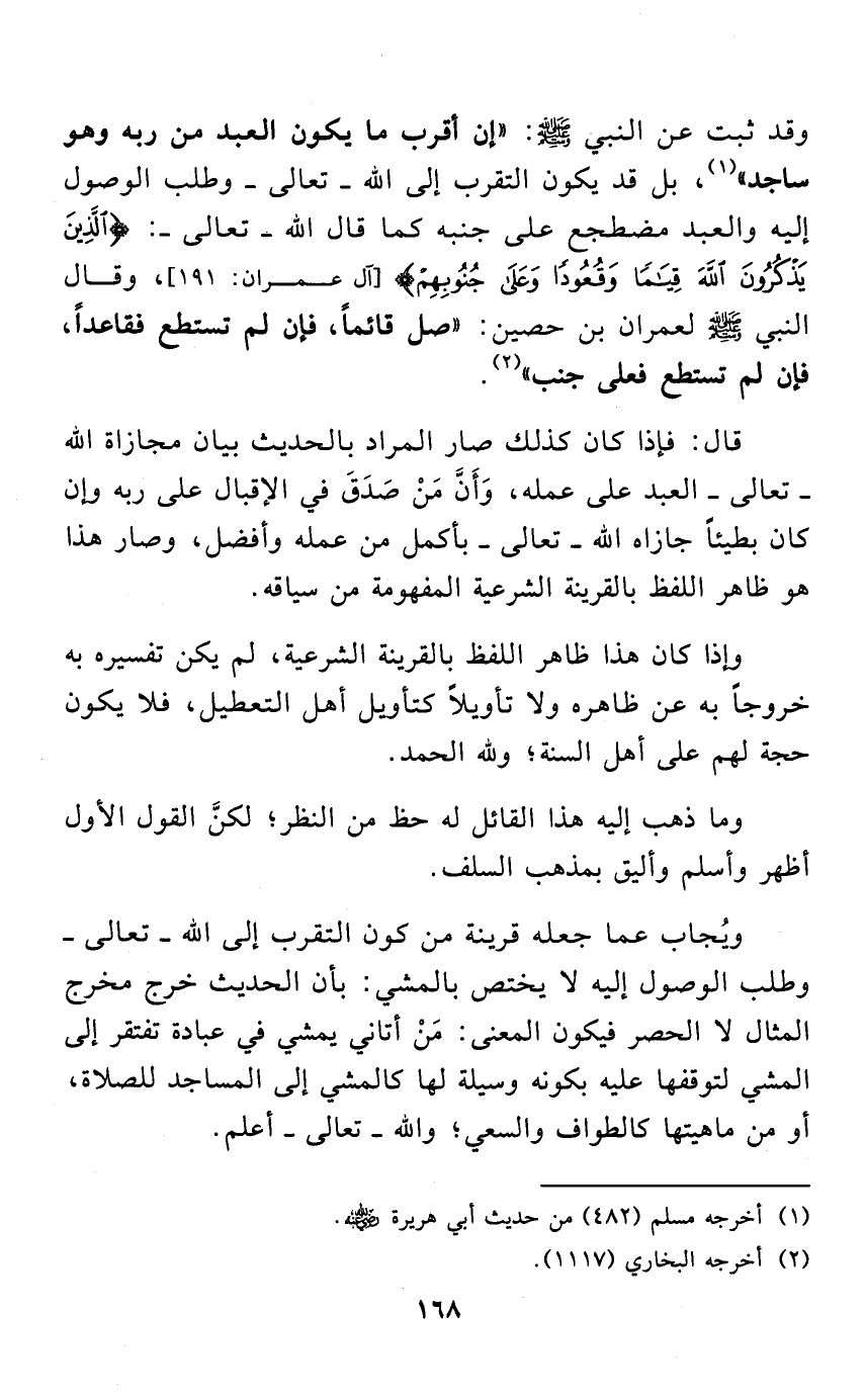 وقد ثبت عن النبي - صلى الله عليه وسلم -: " إن أقرب ما يكون العبد من ربه وهو ساجد " (¬1)، بل قد يكون التقرب إلى الله - تعالى - وطلب الوصول إليه والعبد مضطجع على جنبه كما قال الله - تعالى -: " الَّذِينَ يَذْكُرُونَ اللَّهَ قِيَاماً وَقُعُوداً وَعَلَى جُنُوبِهِمْ " [آل عمران: 191]، وقال النبي - صلى الله عليه وسلم - لعمران بن حصين: " صل قائمًا، فإن لم تستطع فقاعدًا، فإن لم تستطع فعلى جنب " (¬2).