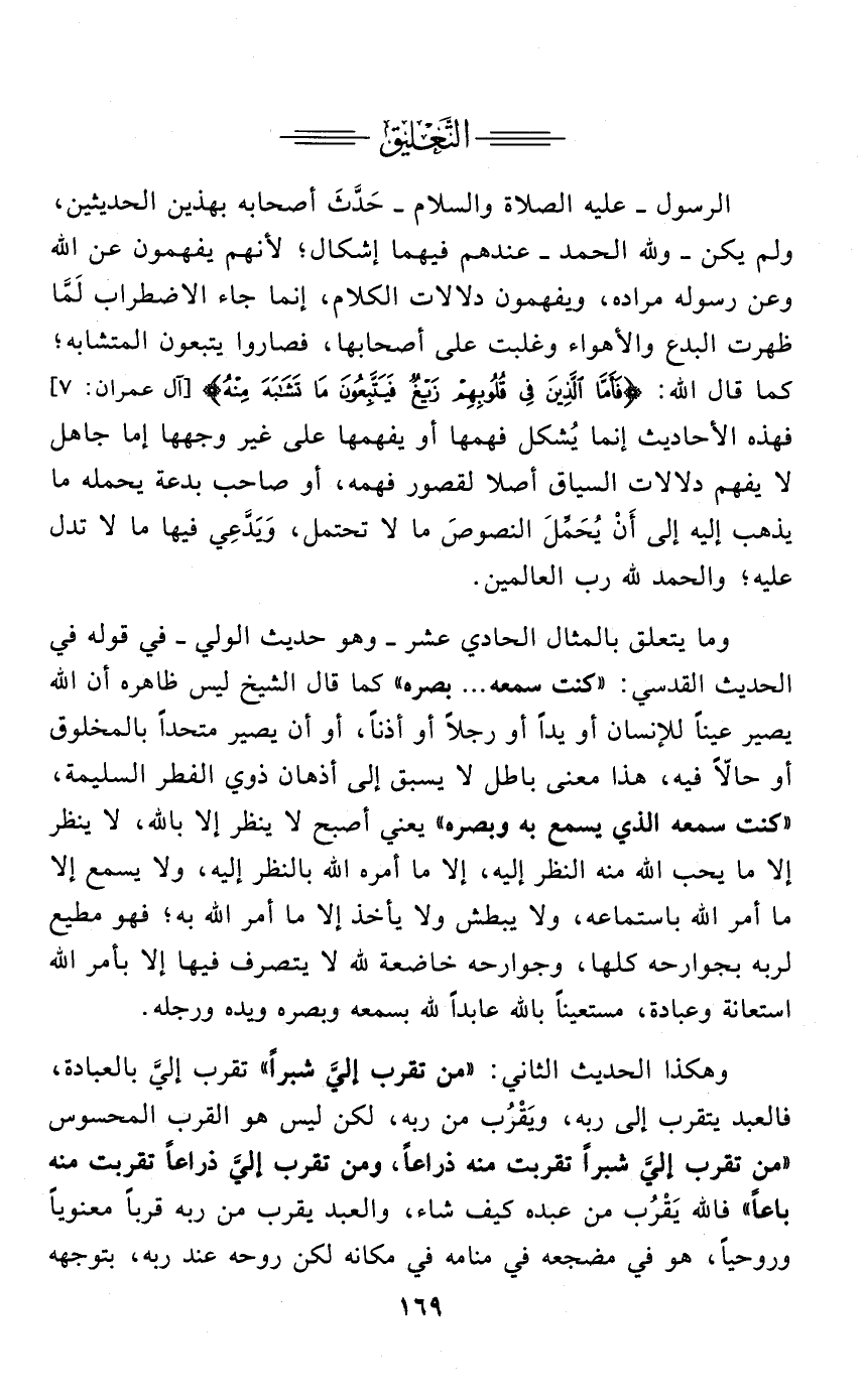 وهكذا الحديث الثاني: " مَنْ تقرب إليَّ شبرًا " تقرب إليَّ بالعبادة , فالعبد يتقرب إلى ربه , ويَقْرُب من ربه , لكن ليس هو القرب المحسوس " من تقرب إليَّ شبرًا تقربت منه ذراعًا، ومن تقرب إليَّ ذراعًا تقربت منه باعًا " فالله يَقْرُب من عبده كيف شاء، والعبد يقرب من ربه قربًا معنويًا وروحيًا، هو في مضجعه في منامه في مكانه لكن روحه عند ربه , بتوجهه