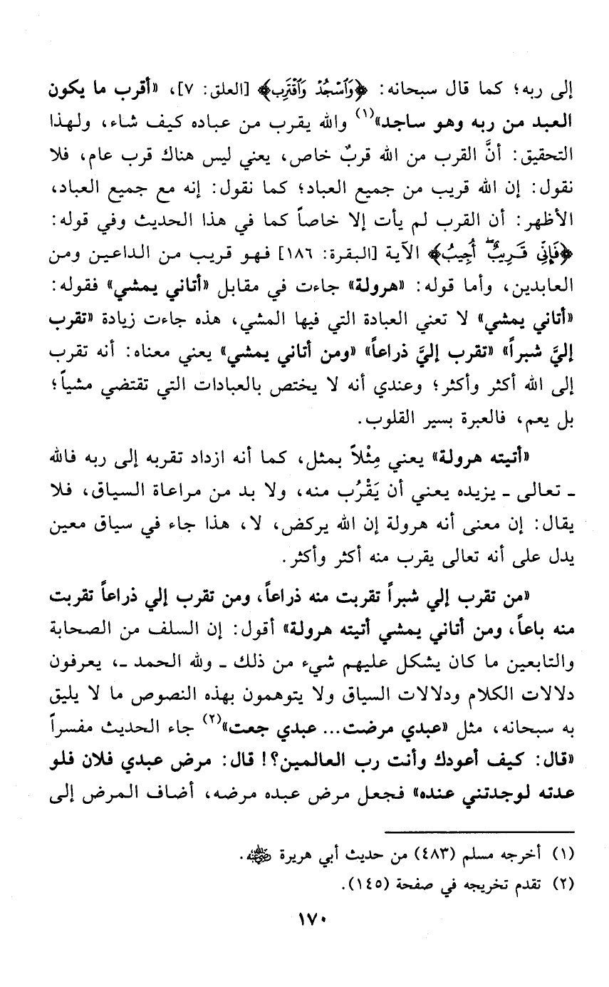 إلى ربه؛ كما قال سبحانه: " واسجد واقترب " [العلق: 7] , " أقرب ما يكون العبد من ربه وهو ساجد " (¬1) والله يقرب من عباده كيف شاء , ولهذا التحقيق: أنَّ القرب من الله قربٌ خاص , يعني ليس هناك قرب عام , فلا نقول: إن الله قريب من جميع العباد؛ كما نقول: إنه مع جميع العباد , الأظهر: أن القرب لم يأت إلا خاصًا كما في هذا الحديث وفي قوله: " إني قريب أجيب " الآية [البقرة: 186] فهو قريب من الداعين ومن العابدين , وأما قوله: " هرولة " جاءت في مقابل " أتاني يمشي " فقوله: " أتاني يمشي " لا تعني العبادة التي فيها المشي , هذه جاءت زيادة " تقرب إليَّ شبرًا " " تقرب إليَّ ذراعًا " " ومن أتاني يمشي " يعني معناه: أنه تقرب إلى الله أكثر وأكثر؛ وعندي أنه لا يختص بالعبادات التي تقتضي مشيًا؛ بل يعم , فالعبرة بسير القلوب.