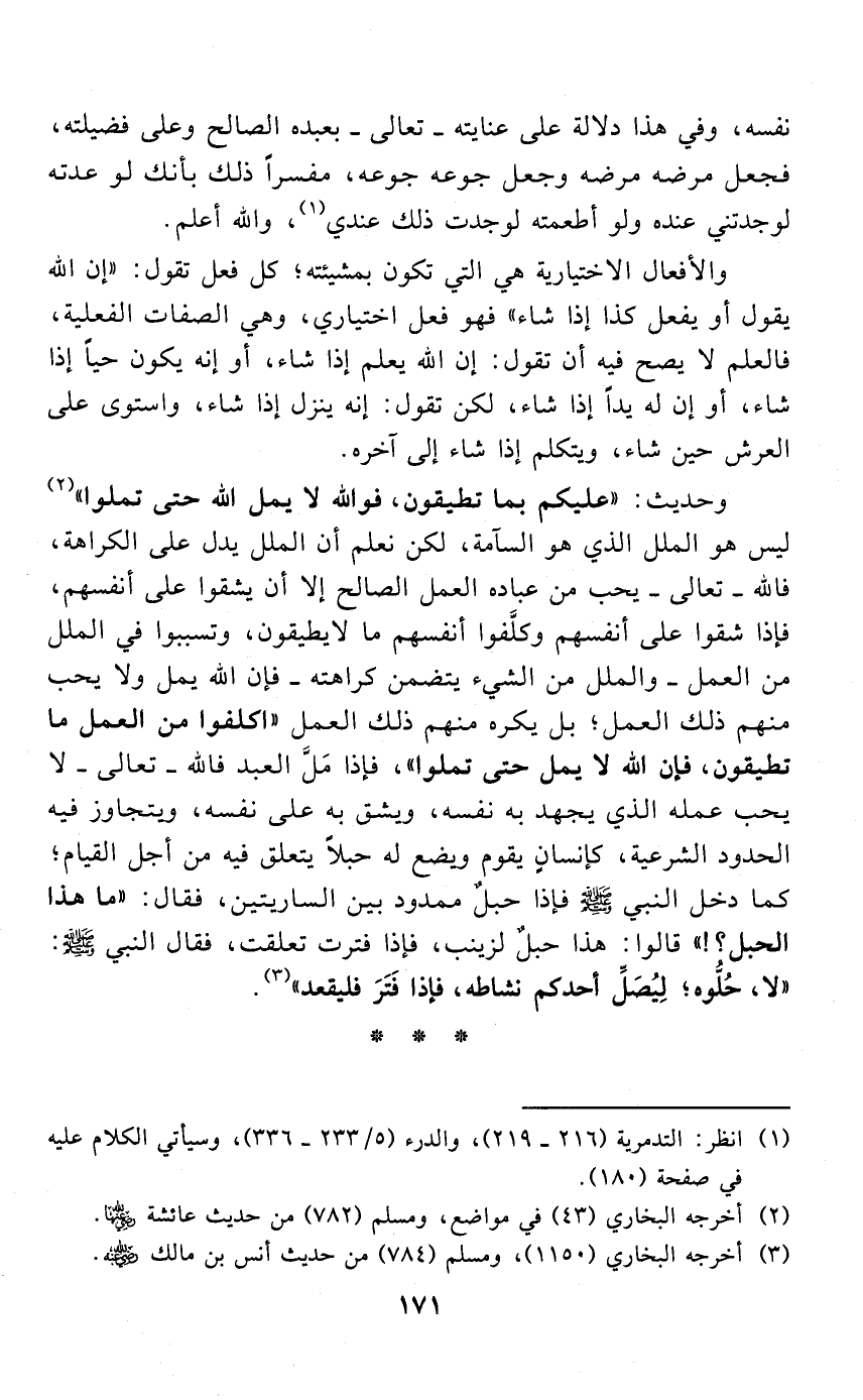 وحديث: " عليكم بما تطيقون، فوالله لا يمل الله حتى تملوا " (¬2) ليس هو الملل الذي هو السآمة , لكن نعلم أن الملل يدل على الكراهة , فالله - تعالى - يحب من عباده العمل الصالح إلا أن يشقوا على أنفسهم , فإذا شقوا على أنفسهم وكلَّفوا أنفسهم مالا يطيقون فإن الله يكره منهم ذلك , يكره العمل , فالملل من الشيء يتضمن كراهته , فالله - تعالى - يحب العمل الصالح من عباده ما لم يشقوا على أنفسهم , فإذا شقوا على أنفسهم وتسببوا في الملل من العمل , فإن الله يمل ولا يحب منهم ذلك العمل؛ بل يكره منهم ذلك العمل " اكلفوا من العمل ما تطيقون، فإن الله لا يمل حتى تملوا "، فإذا مَلَّ العبد فالله - تعالى - لا يحب عمله الذي يجهد به نفسه، ويشق به على نفسه، ويتجاوز فيه الحدود الشرعية , كإنسانٍ يقوم ويضع له حبلًا يتعلق فيه من أجل القيام؛ كما دخل النبي - صلى الله عليه وسلم - فإذا حبلٌ ممدود بين الساريتين، فقال: " ما هذا الحبل؟! " قالوا: هذا حبلٌ لزينب، فإذا فترت تعلقت، فقال النبي - صلى الله عليه وسلم -: " لا، حُلُّوه؛ لِيُصَلِّ أحدكم نشاطه، فإذا فَتَرَ فليقعد " (¬3).