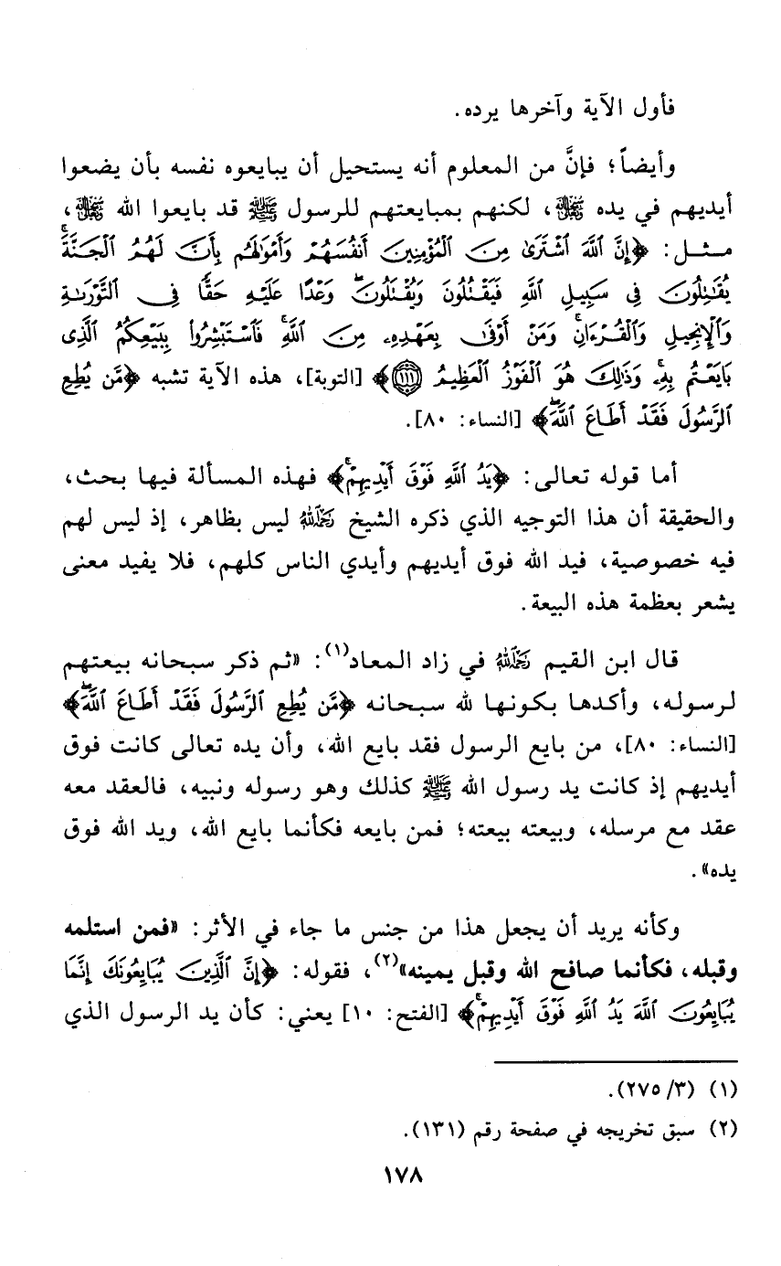 قال ابن القيم - رحمه الله - في زاد المعاد (¬1): (ثم ذكر سبحانه بيعتهم لرسوله، وأكدها بكونها لله سبحانه " من يطع الرسول فقد أطاع الله " [النساء: 80] , من بايع الرسول فقد بايع الله، وأن يده تعالى كانت فوق أيديهم إذ كانت يد رسول الله - صلى الله عليه وسلم - كذلك وهو رسوله ونبيه، فالعقد معه عقد مع مرسله، وبيعته بيعته؛ فمن بايعه فكأنما بايع الله، ويد الله فوق يده).