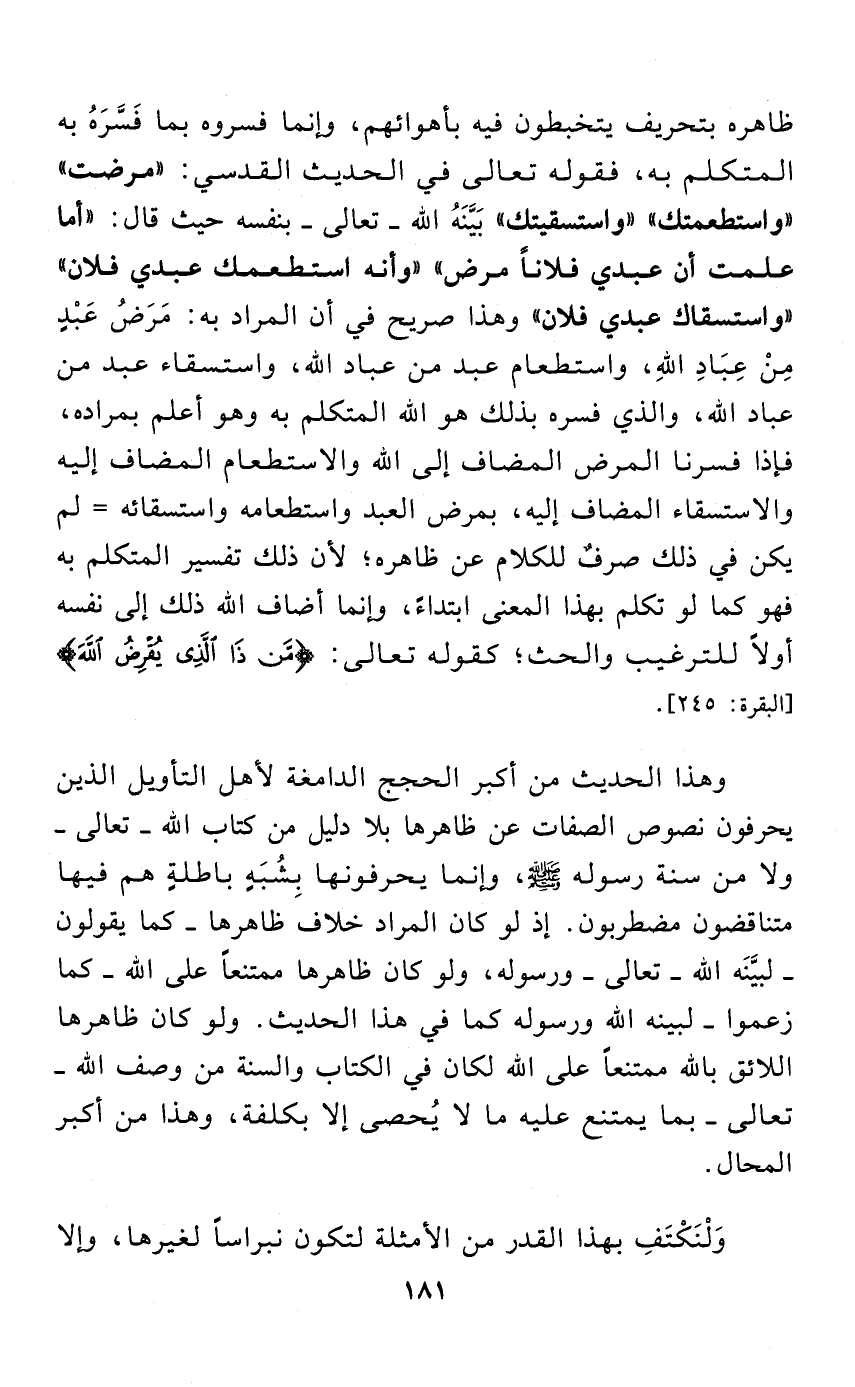 ظاهره بتحريف يتخبطون فيه بأهوائهم، وإنما فسروه بما فَسَّرَهُ به المتكلم به، فقوله تعالى في الحديث القدسي: " مرضت " " واستطعمتك " " واستسقيتك " بَيَّنَهُ الله - تعالى - بنفسه حيث قال: " أما علمت أن عبدي فلانًا مرض " " وأنه استطعمك عبدي فلان " " واستسقاك عبدي فلان " وهذا صريح في أن المراد به: مَرَضُ عَبْدٍ مِنْ عِبَادِ اللهِ، واستطعام عبد من عباد الله، واستسقاء عبد من عباد الله، والذي فسره بذلك هو الله المتكلم به وهو أعلم بمراده، فإذا فسرنا المرض المضاف إلى الله والاستطعام المضاف إليه والاستسقاء المضاف إليه، بمرض العبد واستطعامه واستسقائه = لم يكن في ذلك صرفٌ للكلام عن ظاهره؛ لأن ذلك تفسير المتكلم به فهو كما لو تكلم بهذا المعنى ابتداءً، وإنما أضاف الله ذلك إلى نفسه أولًا للترغيب والحث؛ كقوله تعالى: " مَنْ ذَا الَّذِي يُقْرِضُ اللَّهَ " [البقرة: 245].