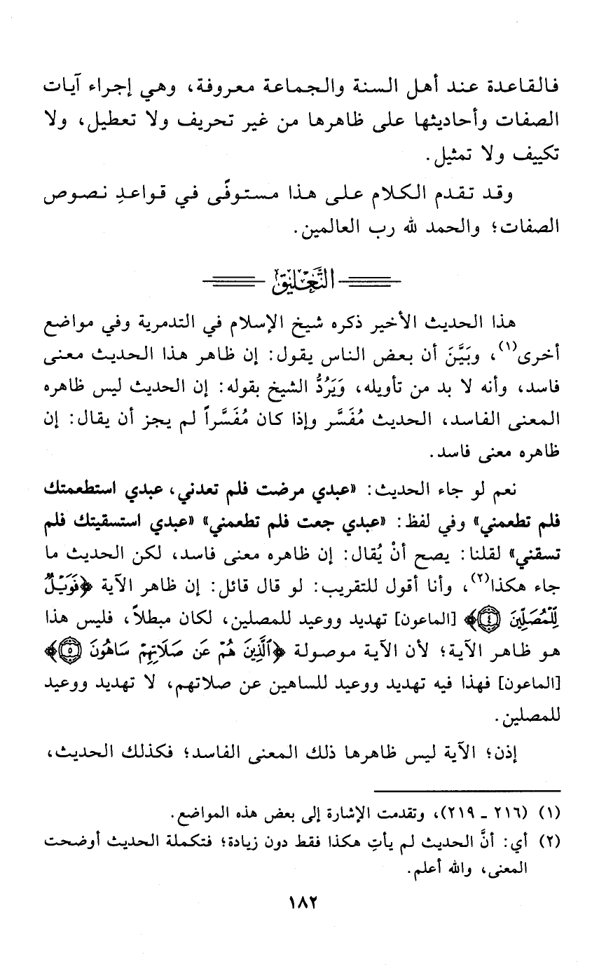 نعم لو جاء الحديث: "عبدي مرضت فلم تعدني، عبدي استطعمتك فلم تطعمني " وفي لفظ: " عبدي جعت فلم تطعمني " " عبدي استسقيتك فلم تسقني " لقلنا: يصح أنْ يُقال: إن ظاهره معنى فاسد , لكن الحديث ما جاء هكذا (¬2) , وأنا أقول للتقريب: لو قال قائل: إن ظاهر الآية " فويل للمصلين " [الماعون] تهديد ووعيد للمصلين , لكان مبطلًا , فليس هذا هو ظاهر الآية , لأن الآية موصولة " الذين هم عن صلاتهم ساهون " [الماعون] فهذا فيه تهديد ووعيد للساهين عن صلاتهم، لا تهديد ووعيد للمصلين.