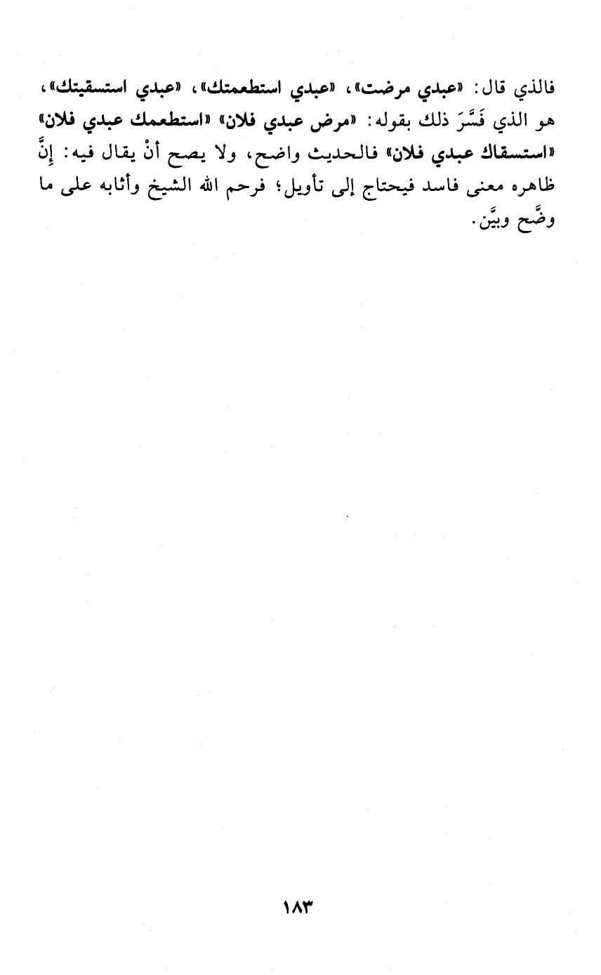 فالذي قال: " عبدي مرضت " , " عبدي استطعمتك " , " عبدي استسقيتك " , هو الذي فَسَّرَ ذلك بقوله: " مرض عبدي فلان " " استطعمك عبدي فلان " " استسقاك عبدي فلان " فالحديث واضح، ولا يصح أنْ يقال فيه: إِنَّ ظاهره معنى فاسد فيحتاج إلى تأويل؛ فرحم الله الشيخ وأثابه على ما وضَّح وبيَّن.