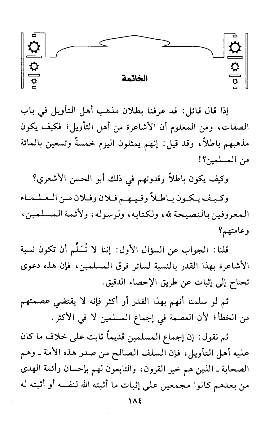 ثم نقول: إن إجماع المسلمين قديمًا ثابت على خلاف ما كان عليه أهل التأويل، فإن السلف الصالح من صدر هذه الأمة - وهم الصحابة - الذين هم خير القرون، والتابعون لهم بإحسان وأئمة الهدى من بعدهم كانوا مجمعين على إثبات ما أثبته الله لنفسه أو أثبته له