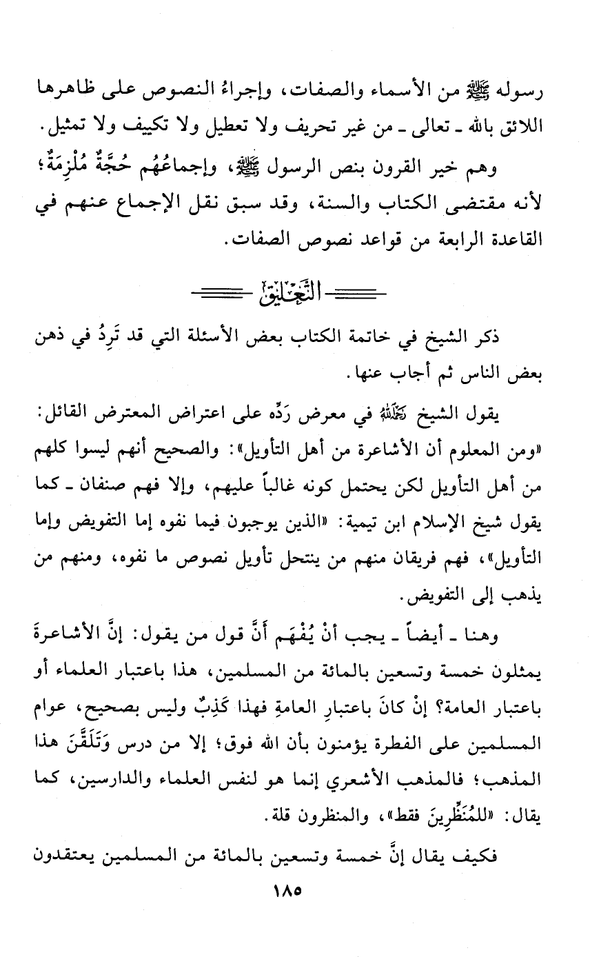 يقول الشيخ - رحمه الله - في معرض رَدِّه على اعتراض المعترض القائل: (ومن المعلوم أن الأشاعرة من أهل التأويل): والصحيح أنهم ليسوا كلهم من أهل التأويل لكن يحتمل كونه غالبًا عليهم، وإلا فهم صنفان - كما يقول الشيخ - الذين يوجبون فيما نفوه إما التفويض وإما التأويل , فهم فريقان منهم من ينتحل تأويل نصوص ما نفوه , ومنهم من يذهب إلى التفويض.