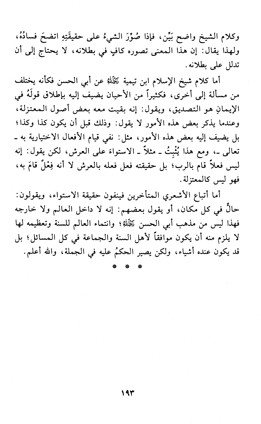 أما كلام شيخ الإسلام ابن تيمية - رحمه الله - عن أبي الحسن فكأنه يختلف من مسألة إلى أخرى , فكثيرًا من الأحيان يضيف إليه بإطلاق قولَهُ في الإيمانِ هو التصديق , ويقول: إنه بقيت معه بعض أصول المعتزلة , وعندما يذكر بعض هذه الأمور لا يقول: وذلك قبل أن يكون كذا وكذا؛ بل يضيف إليه بعض هذه الأمور , مثل: نفي قيام الأفعال الاختيارية به - تعالى -، ومع هذا يُثْبِتُ - مثلًا - الاستواءَ على العرش , لكن يقول: إنه ليس فعلًا قام بالرب؛ بل حقيقته فعل فعله بالعرش لا أنه فِعْلٌ قامَ به , فهو ليس كالمعتزلة (¬1) , أما أتباع الأشعري المتأخرين فينفون حقيقة الاستواء , ويقولون: حالٌّ في كل مكان، أو يقول بعضهم: إنه لا داخل العالم ولا خارجه فهذا ليس من مذهب أبي الحسن - رحمه الله -؛ وانتماء العالم للسنة وتعظيمه لها لا يلزم منه أن يكون موافقًا لأهل السنة والجماعة في كل المسائل؛ بل قد يكون عنده أشياء، ولكن يصير الحكمُ عليه في الجملة , والله أعلم.