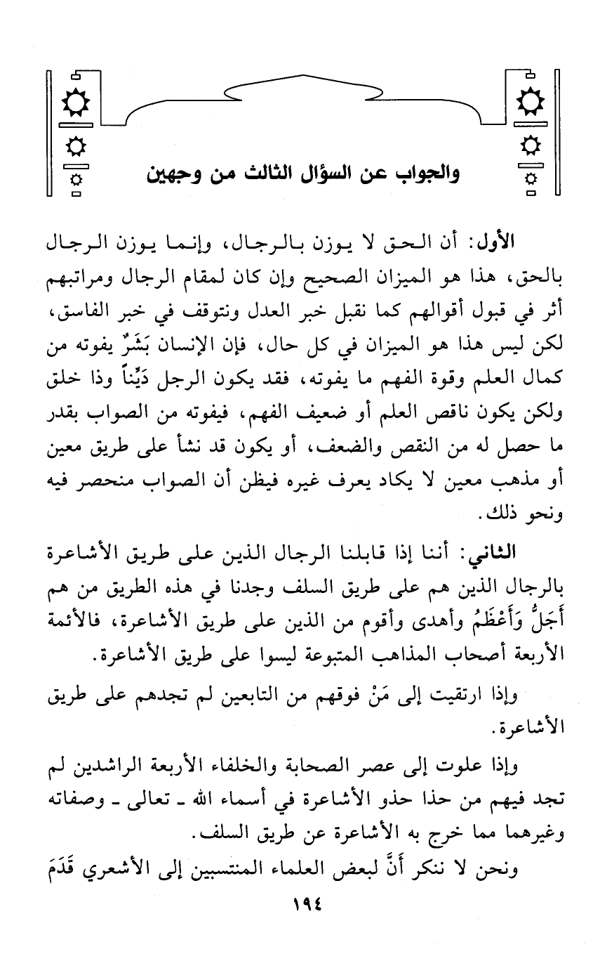 الثاني: أننا إذا قابلنا الرجال الذين على طريق الأشاعرة بالرجال الذين هم على طريق السلف وجدنا في هذه الطريق من هم أَجَلُّ وَأَعْظَمُ وأهدى وأقوم من الذين على طريق الأشاعرة، فالأئمة الأربعة أصحاب المذاهب المتبوعة ليسوا على طريق الأشاعرة.