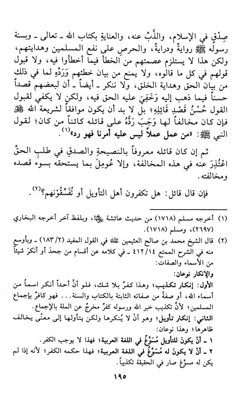 (¬2) قال الشيخ محمد بن صالح العثيمين - رحمه الله - في القول المفيد (2/ 183) - وبأوسع منه في الشرح الممتع 14/ 412 - في كلامه عن أقسام من جحدَ أو أنكرَ شيئًا من الأسماء والصفات: