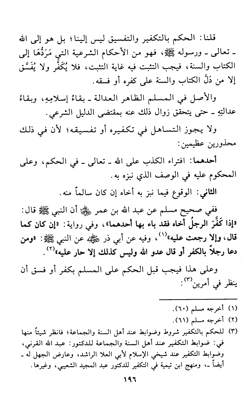 وعلى هذا فيجب قبل الحكم على المسلم بكفر أو فسق أن ينظر في أمرين (¬3):