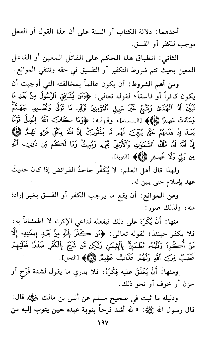 أحدهما: دلالة الكتاب أو السنة على أن هذا القول أو الفعل موجب للكفر أو الفسق.
