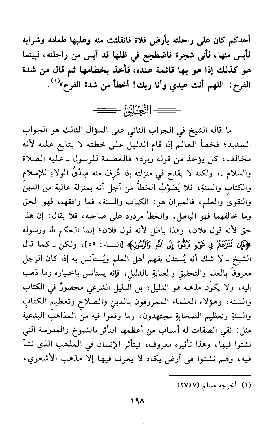 أحدكم كان على راحلته بأرض فلاة فانفلتت منه وعليها طعامه وشرابه فأيس منها، فأتى شجرة فاضطجع في ظلها قد أيس من راحلته، فبينما هو كذلك إذا هو بها قائمة عنده، فأخذ بخطامها ثم قال من شدة الفرح: اللهم أنت عبدي وأنا ربك! أخطأ من شدة الفرح " (¬1).