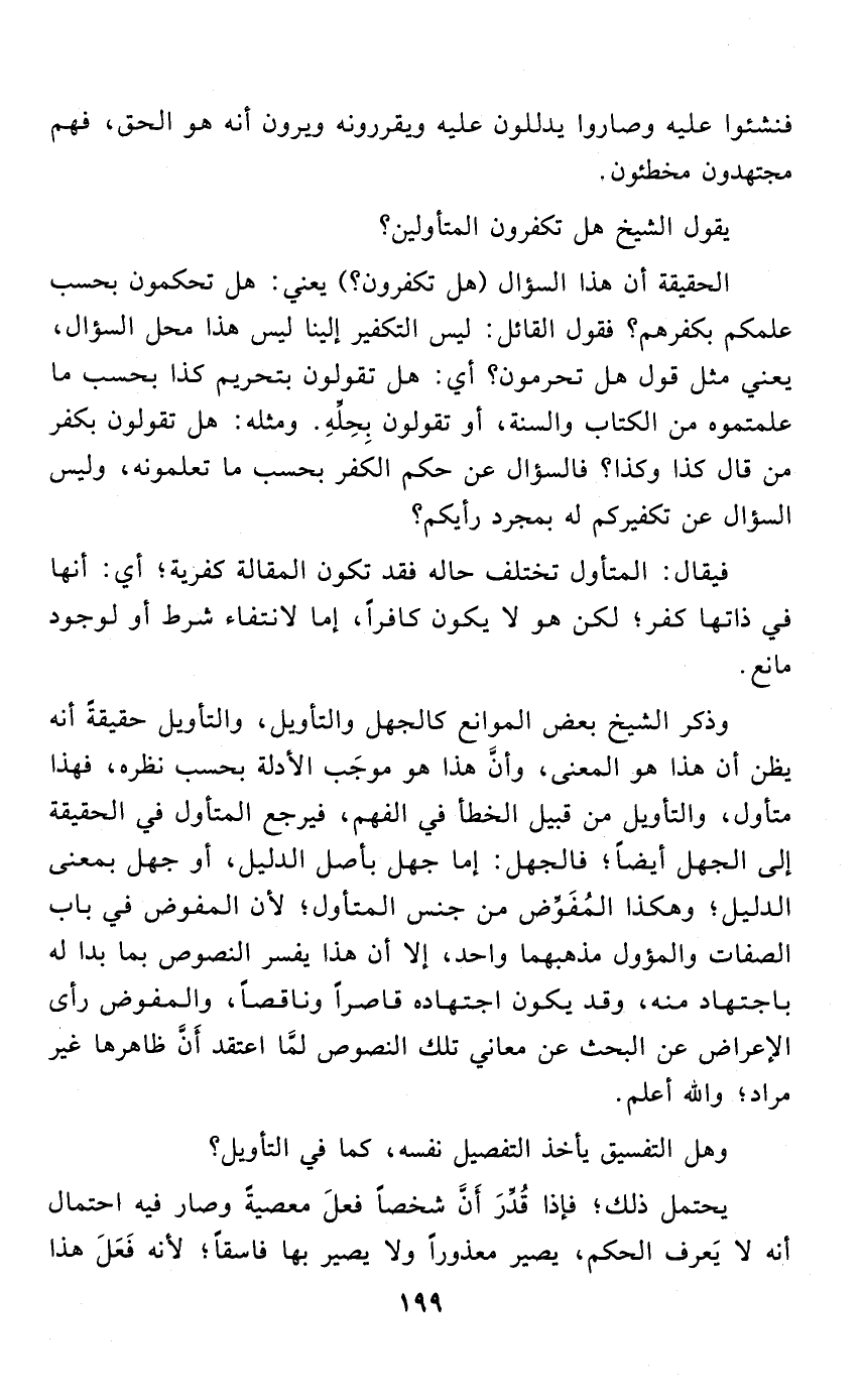 وذكر الشيخ بعض الموانع كالجهل والتأويل , والتأويل حقيقةً أنه يظن أن هذا هو المعنى , وأنَّ هذا هو موجَب الأدلة بحسب نظره , فهذا متأول , والتأويل من قبيل الخطأ في الفهم , فيرجع المتأول في الحقيقة إلى الجهل أيضًا؛ فالجهل: إما جهل بأصل الدليل، أو جهل بمعنى الدليل؛ وهكذا المُفَوِّض من جنس المتأول، لأن المفوض في باب الصفات والمؤول مذهبهما واحد , إلا أن هذا يفسر النصوص بما بدا له باجتهاد منه , وقد يكون اجتهاده قاصرًا وناقصًا , والمفوض رأى الإعراض عن البحث عن معاني تلك النصوص لمَّا اعتقد أَنَّ ظاهرها غير مراد؛ والله أعلم.