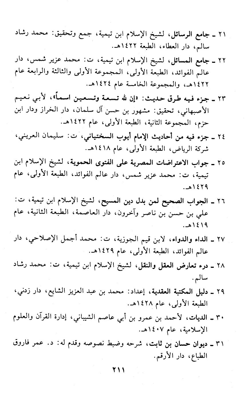 22 - جامع المسائل، لشيخ الإسلام ابن تيمية، ت. محمد عزير شمس، دار عالم الفوائد، الطبعة الأولى، المجموعة الأولى والثالثة والرابعة عام 1422 هـ، والمجموعة الخامسة عام 1424 هـ.