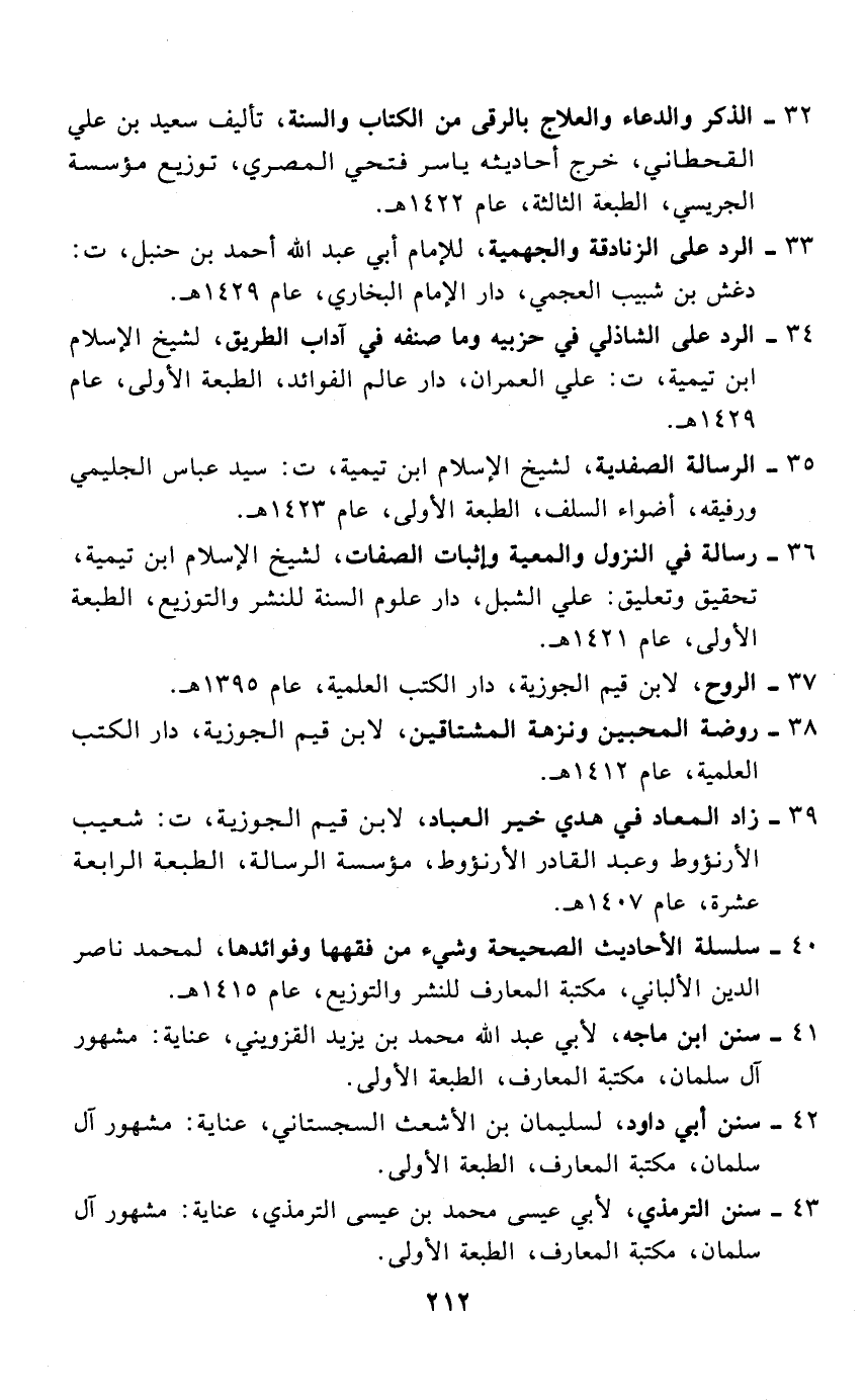 32 - الذكر والدعاء والعلاج بالرقى من الكتاب والسنة، تأليف سعيد بن علي القحطاني، خرج أحاديثه ياسر فتحي المصري، توزيع مؤسسة الجريسي، الطبعة الثالثة، عام 1422 هـ.