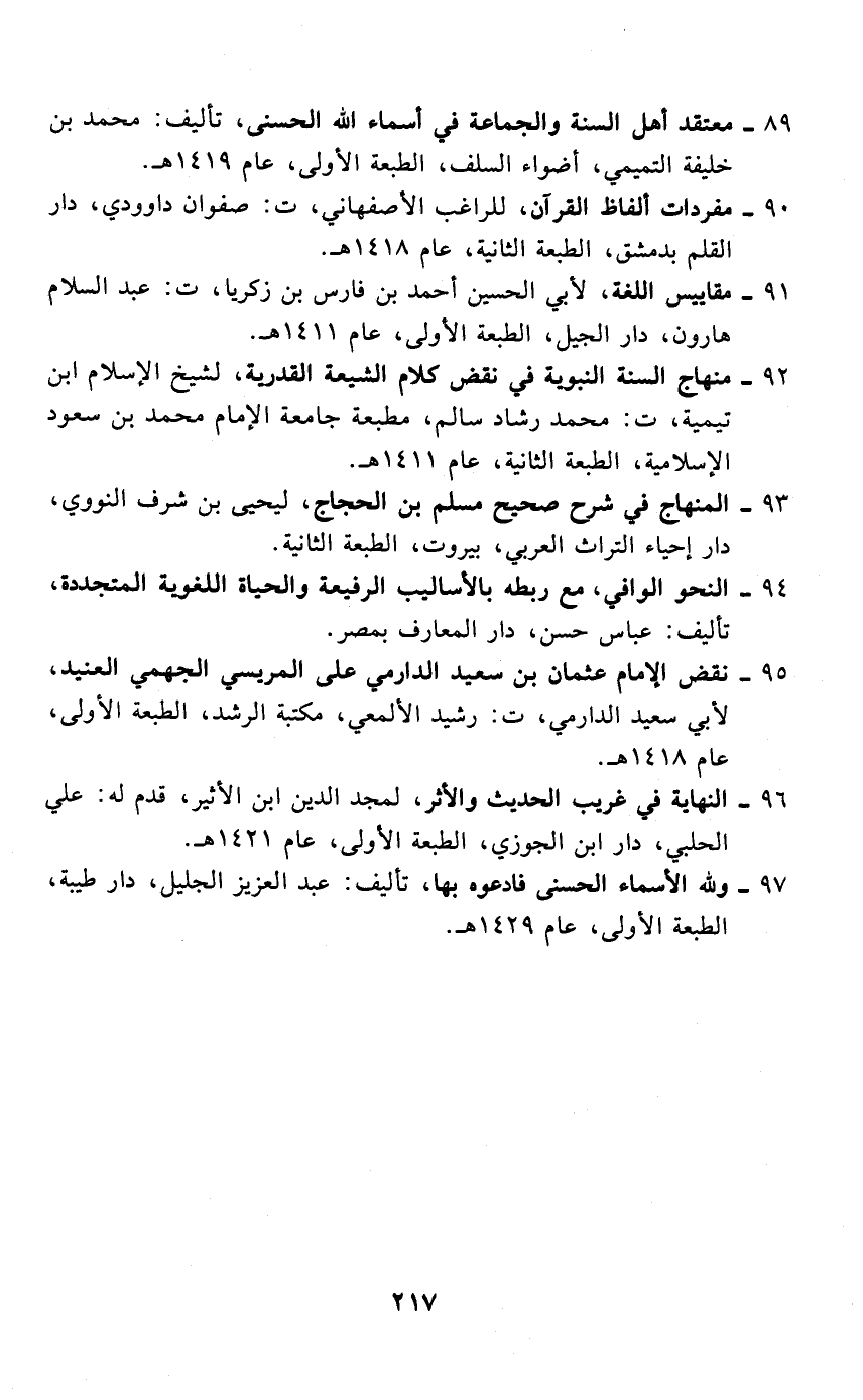 95 - نقض الإمام عثمان بن سعيد الدارمي على المريسي الجهمي العنيد، لأبي سعيد الدارمي، ت. رشيد الألمعي، مكتبة الرشد، الطبعة الأولى، عام 1418 هـ.