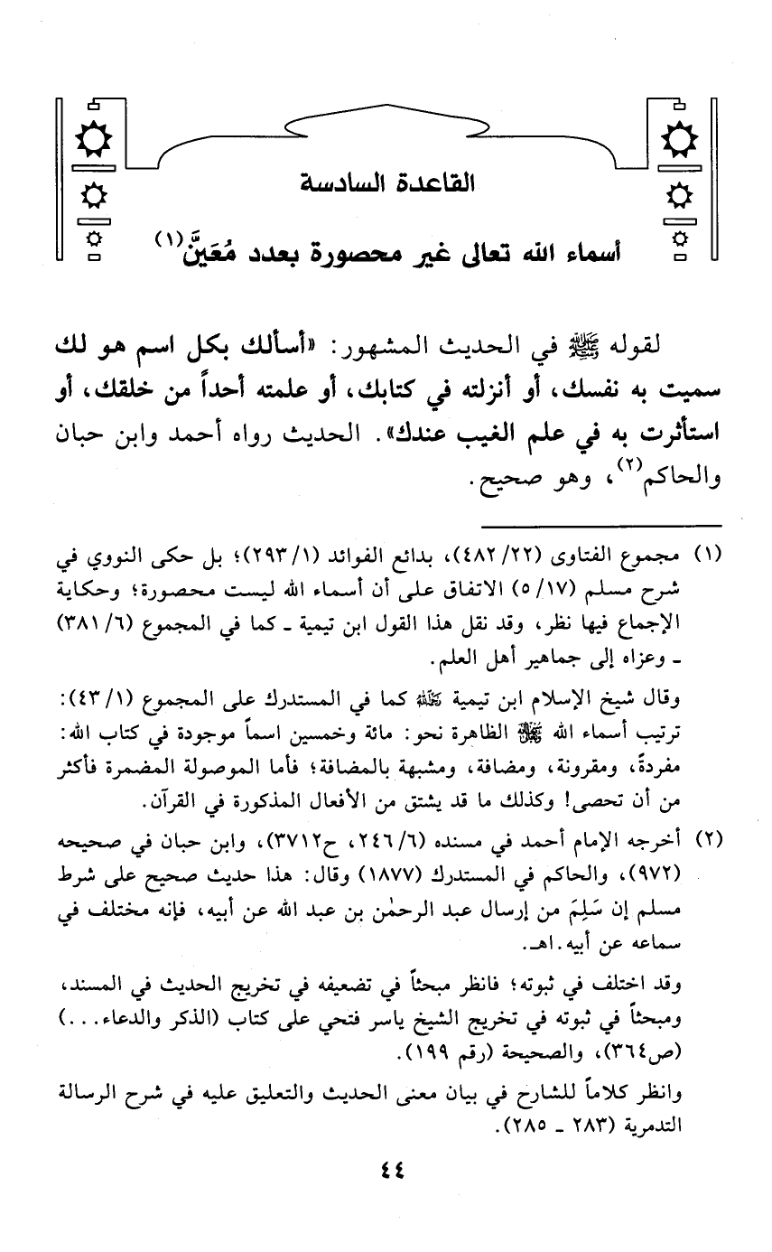 (¬1) مجموع الفتاوى (22/ 482)، بدائع الفوائد (1/ 293)؛ بل حكى النووي في شرح مسلم (17/ 5) الاتفاق على أن أسماء الله ليست محصورة؛ وحكاية الإجماع فيها نظر، وقد نقل هذا القول ابن تيمية - كما في المجموع (6/ 381) - وعزاه إلى جماهير أهل العلم.
