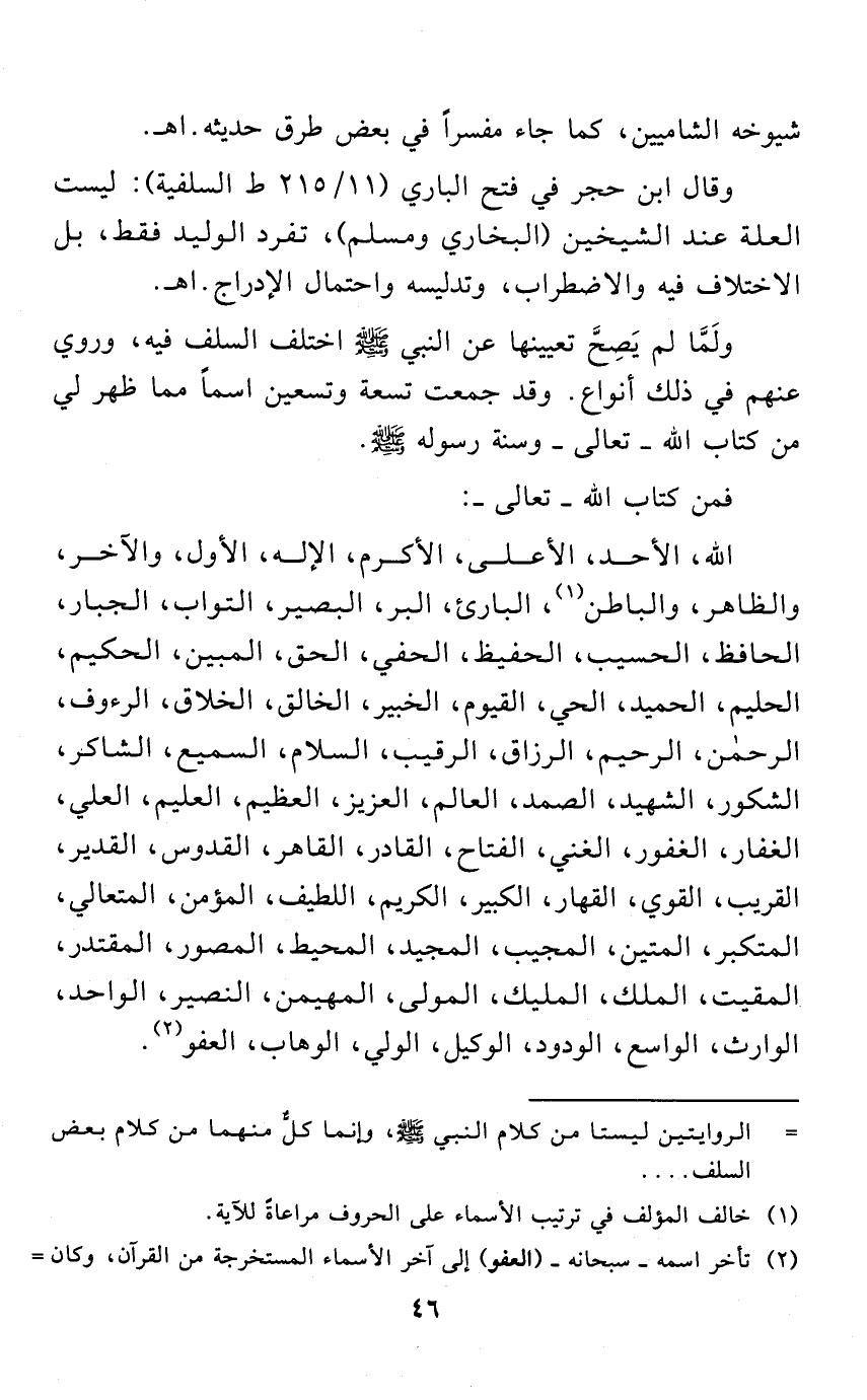 (¬2) تأخر اسمه - سبحانه - (العفو) إلى آخر الأسماء المستخرجة من القرآن، وكان حَقُّه على ترتيب الشيخ بعد (العظيم)؛ ولعل الشيخ - رحمه الله - أَخَّرَهُ تفاؤلًا برحمة الله للكاتب والقارئ.