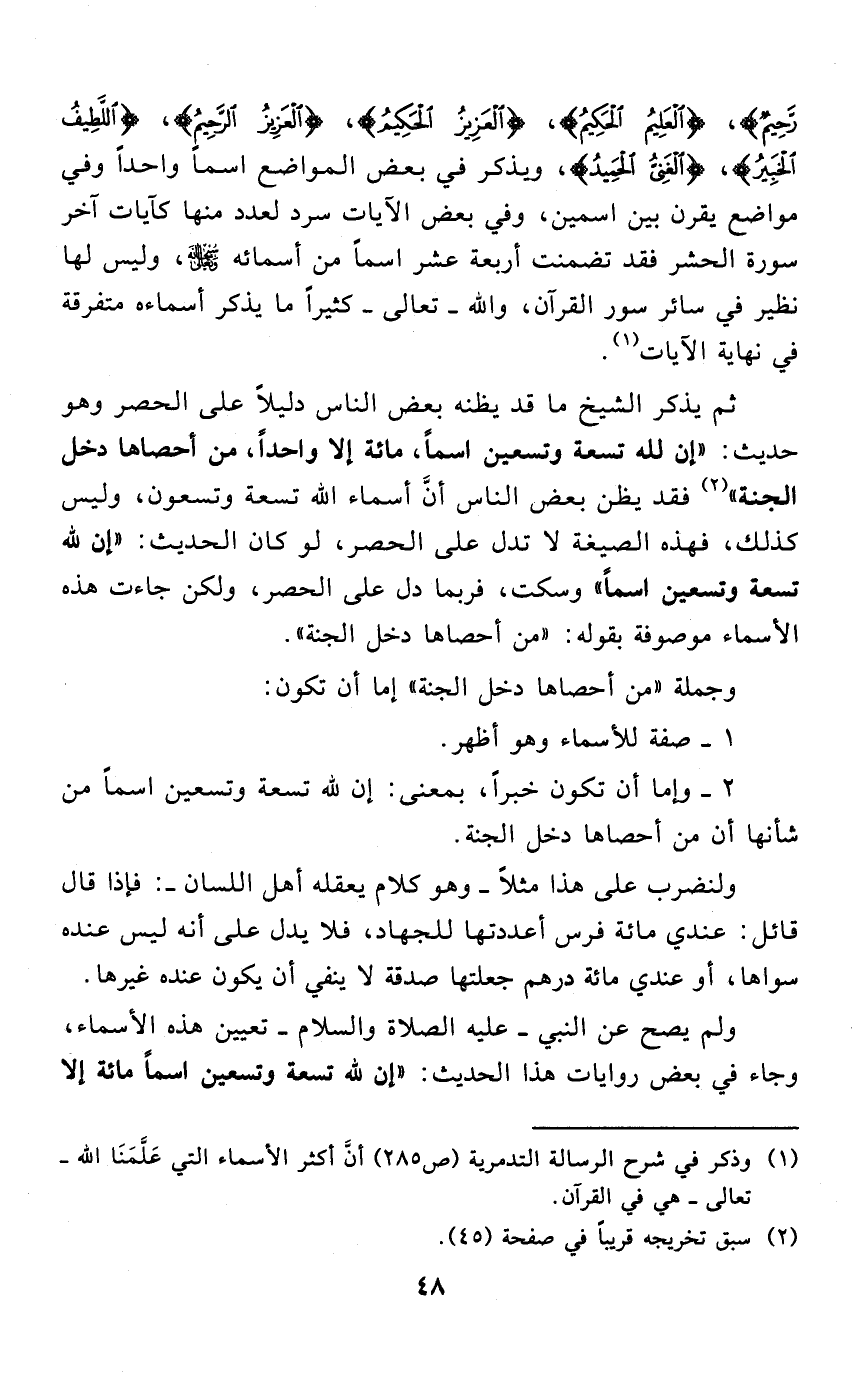 ثم يذكر الشيخ ما قد يظنه بعض الناس دليلًا على الحصر وهو حديث: " إن لله تسعة وتسعين اسمًا، مائة إلا واحدًا، من أحصاها دخل الجنة " (¬2) فقد يظن بعض الناس أنَّ أسماء الله تسعة وتسعون، وليس كذلك , فهذه الصيغة لا تدل على الحصر , لو كان الحديث: " إن لله تسعة وتسعين اسمًا " وسكت، فربما دل على الحصر , ولكن جاءت هذه الأسماء موصوفة بقوله: " من أحصاها دخل الجنة ".
