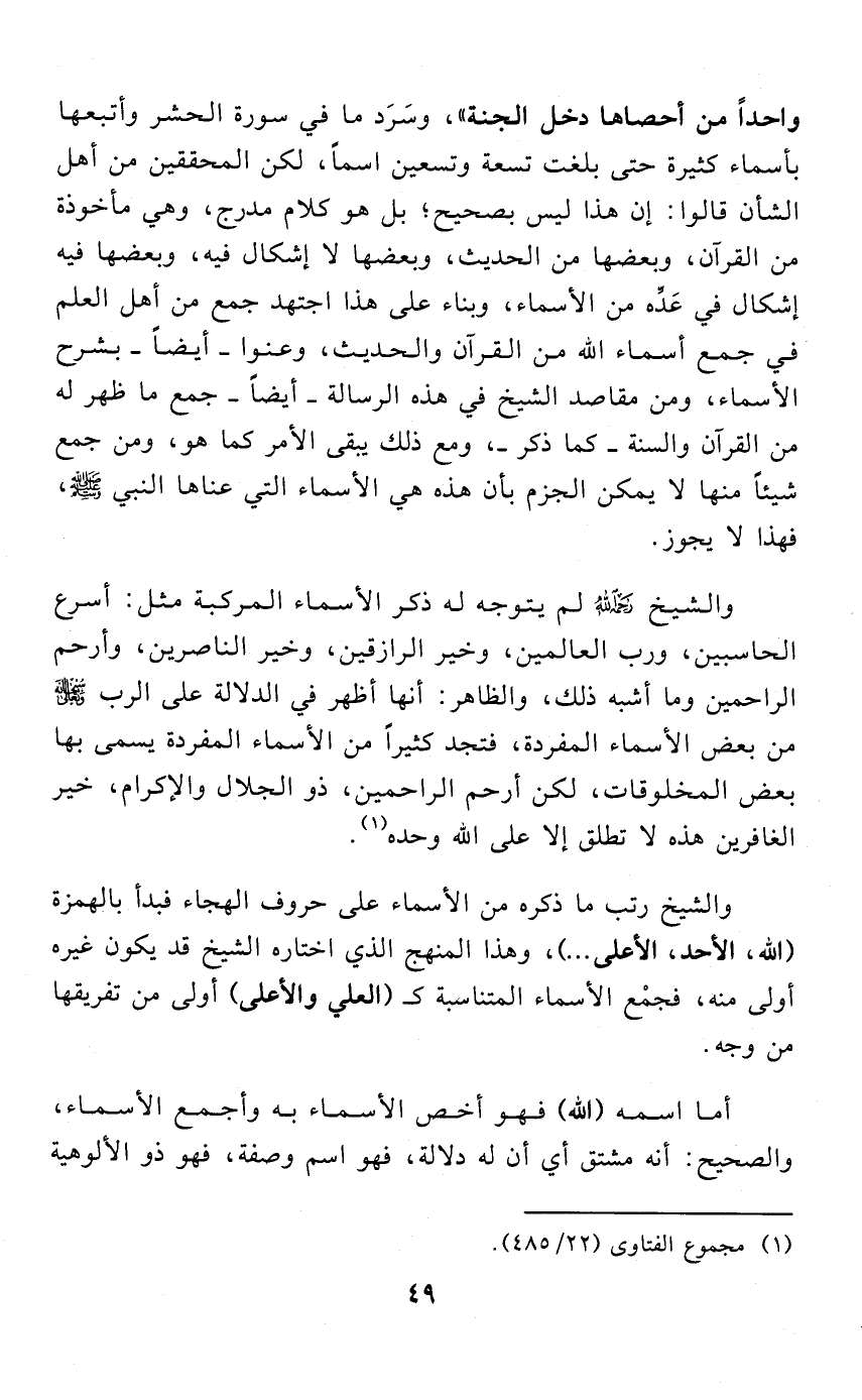 واحدًا من أحصاها دخل الجنة "، وسَرَد ما في سورة الحشر وأتبعها بأسماء كثيرة حتى بلغت تسعة وتسعين اسمًا , لكن المحققين من أهل الشأن قالوا: إن هذا ليس بصحيح؛ بل هو كلام مدرج , وهي مأخوذة من القرآن , وبعضها من الحديث , وبعضها لا إشكال فيه , وبعضها فيه إشكال في عَدِّه من الأسماء , وبناء على هذا اجتهد جمع من أهل العلم في جمع أسماء الله من القرآن والحديث , وعنوا - أيضًا - بشرح الأسماء , ومن مقاصد الشيخ في هذه الرسالة - أيضًا - جمع ما ظهر له من القرآن والسنة - كما ذكر - , ومع ذلك يبقى الأمر كما هو , ومن جمع شيئًا منها لا يمكن الجزم بأن هذه هي الأسماء التي عناها النبي - صلى الله عليه وسلم - , فهذا لا يجوز.