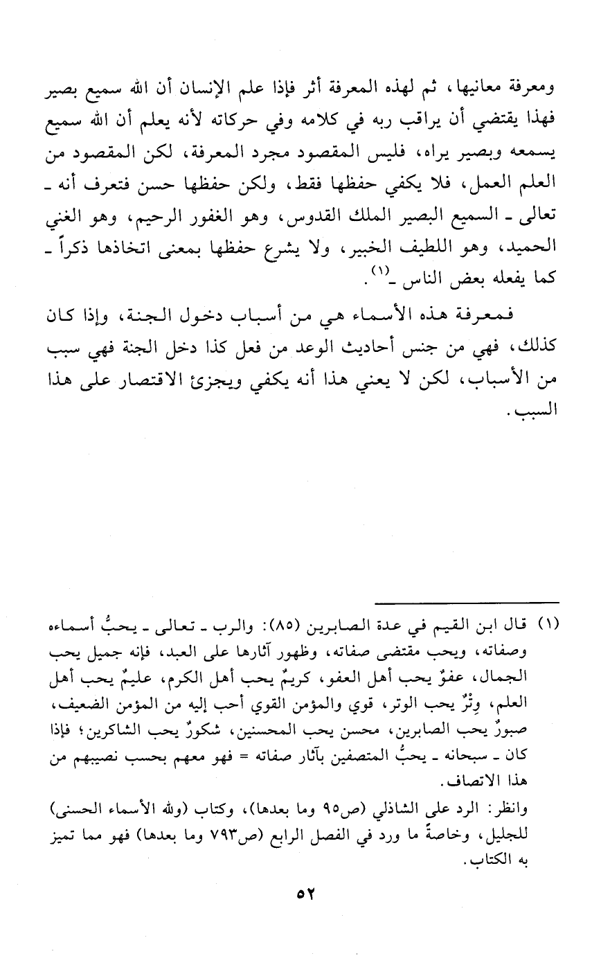 ومعرفة معانيها , ثم لهذه المعرفة أثر فإذا علم الإنسان أن الله سميع بصير فهذا يقتضي أن يراقب ربه في كلامه وفي حركاته لأنه يعلم أن الله سميع يسمعه وبصير يراه، فليس المقصود مجرد المعرفة، لكن المقصود من العلم العمل , فلا يكفي حفظها فقط، ولكن حفظها حسن فتعرف أنه - تعالى - السميع البصير الملك القدوس، وهو الغفور الرحيم، وهو الغني الحميد، وهو اللطيف الخبير , ولا يشرع حفظها بمعنى اتخاذها ذكرًا - كما يفعله بعض الناس - (¬1).