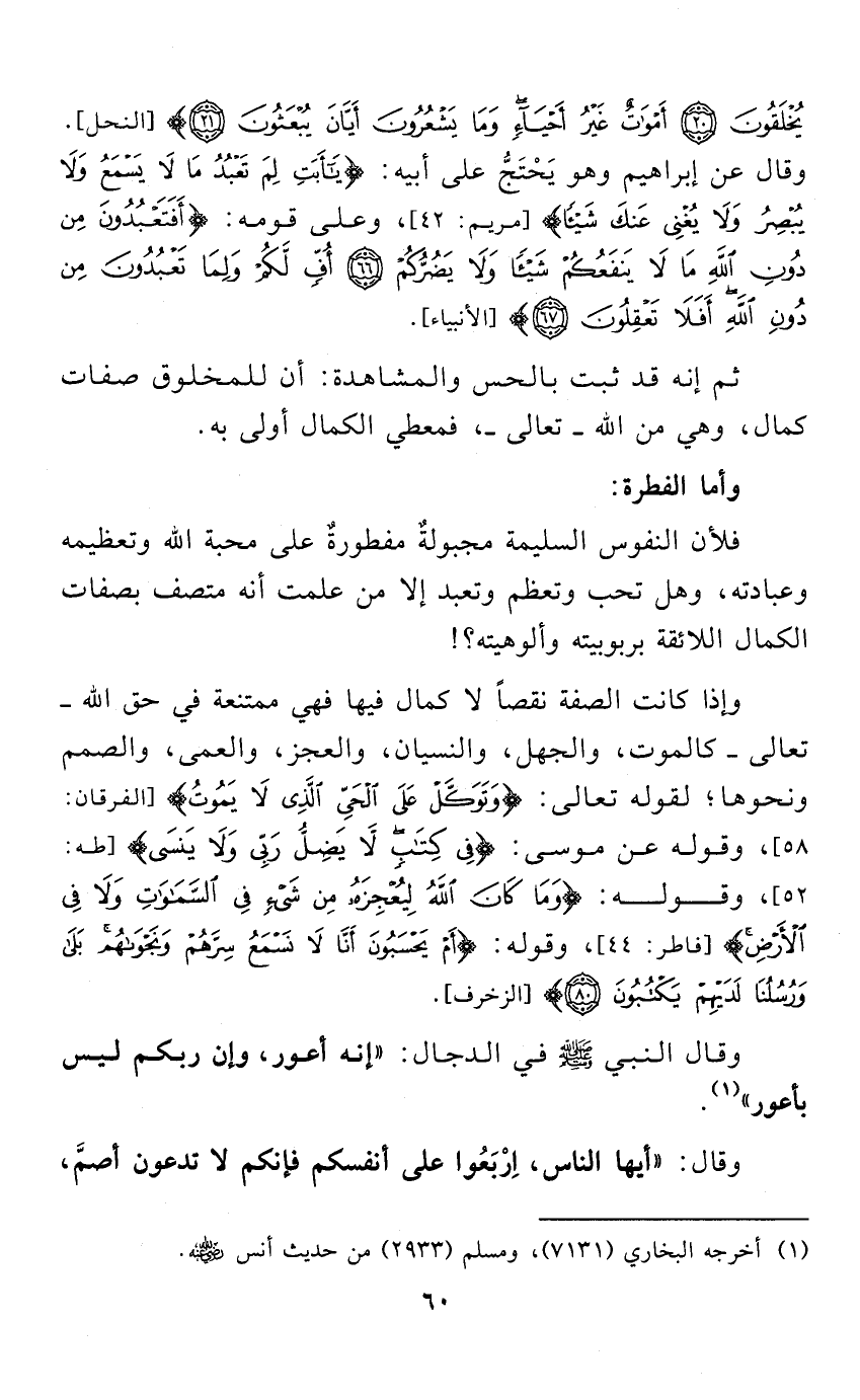 وقال النبي - صلى الله عليه وسلم - في الدجال: " إنه أعور، وإن ربكم ليس بأعور " (¬1).