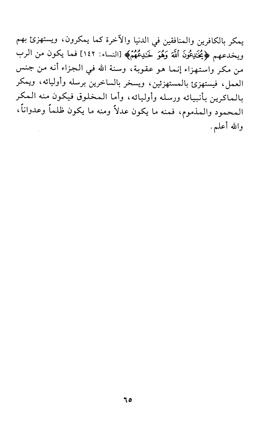 يمكر بالكافرين والمنافقين في الدنيا والآخرة كما يمكرون , ويستهزئ بهم ويخدعهم " يخادعون الله وهو خادعهم " [النساء: 142] فما يكون من الرب من مكر واستهزاء إنما هو عقوبة , وسنة الله في الجزاء أنه من جنس العمل , فيستهزئ بالمستهزئين، ويسخر بالساخرين برسله وأوليائه , ويمكر بالماكرين بأنبيائه ورسله وأوليائه , وأما المخلوق فيكون منه المكر المحمود والمذموم , فمنه ما يكون عدلًا ومنه ما يكون ظلمًا وعدوانًا، والله أعلم.