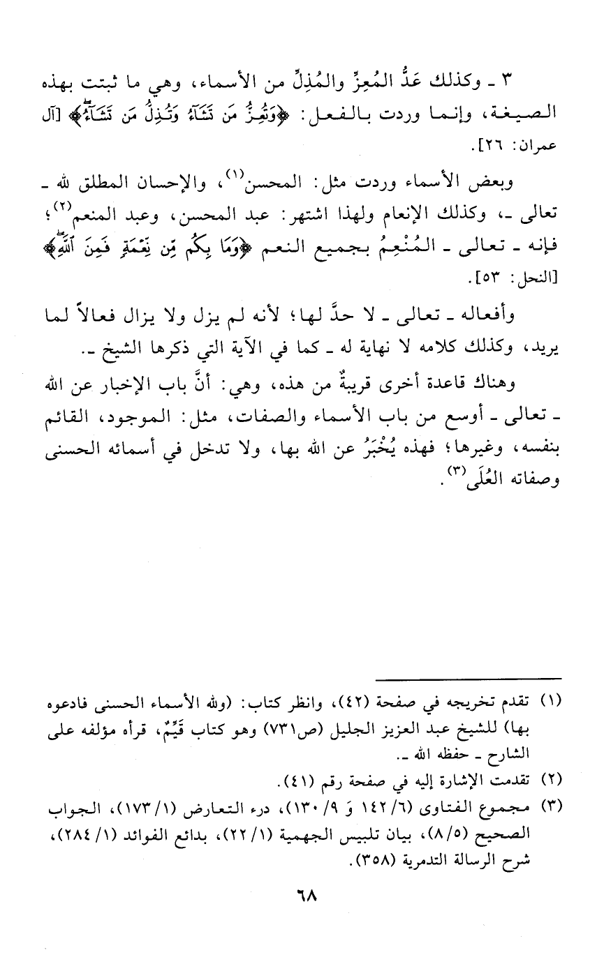 3 - وكذلك عَدُّ المُعِزِّ والمُذِلِّ من الأسماء , وهي ما ثبتت بهذه الصيغة، وإنما وردت بالفعل: " تعز من تشاء وتذل من تشاء " [آل عمران: 26].