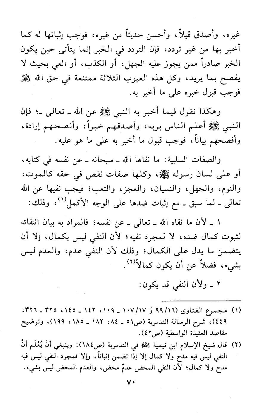 (¬2) قال شيخ الإسلام ابن تيمية - رحمه الله - في التدمرية (ص 184): وينبغي أنْ يُعْلَم أنَّ النفي ليس فيه مدح ولا كمال إلا إذا تضمن إثباتًا، وإلا فمجرد النفي ليس فيه مدح ولا كمال؛ لأن النفي المحض عدمٌ محض، والعدم المحض ليس بشيء ... .