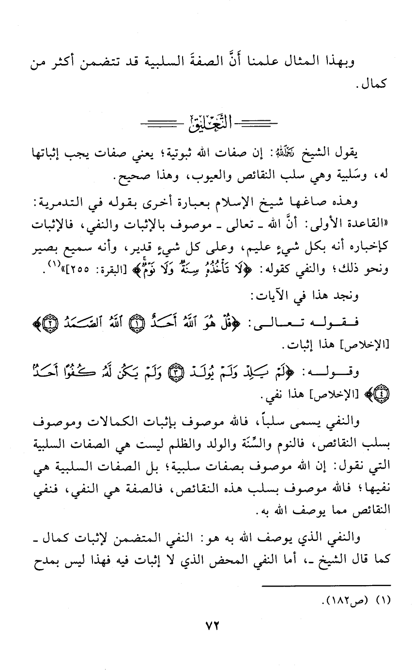 والنفي يسمى سلبًا , فالله موصوف بإثبات الكمالات وموصوف بسلب النقائص , فالنوم والسِّنَة والولد والظلم ليست هي الصفات السلبية التي نقول: إن الله موصوف بصفات سلبية؛ بل الصفات السلبية هي نفيها؛ فالله موصوف بسلب هذه النقائص , فالصفة هي النفي , فنفي النقائص مما يوصف الله به.