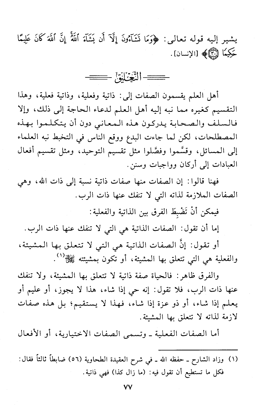 (¬1) قال الشارح - حفظه الله - في العقيدة الطحاوية (56): فكل ما تستطيع أن نقول فيه: (ما زال كذا) فهي ذاتية؛ وضابط الصفات الذاتية والفعلية: أنَّ الذاتية لا تتعلق بها المشيئة، وأما الفعلية فتتعلق بها المشيئة.