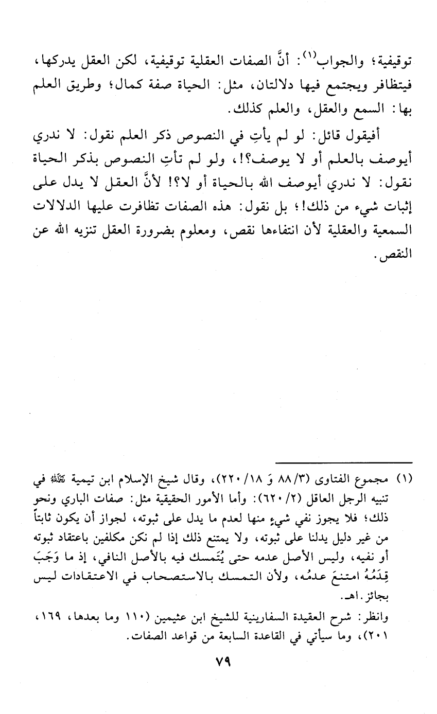 أفيقول قائل: لو لم يأتِ في النصوص ذكر العلم نقول: لا ندري أيوصف بالعلم أو لا يوصف؟! , ولو لم تأتِ النصوص بذكر الحياة نقول: لا ندري أيوصف الله بالحياة أو لا؟! لأنَّ العقل لا يدل على إثبات شيء من ذلك!؛ بل نقول: هذه الصفات تظافرت عليها الدلالات السمعية والعقلية لأن انتفاءها نقص , ومعلوم بضرورة العقل تنزيه الله عن النقص.