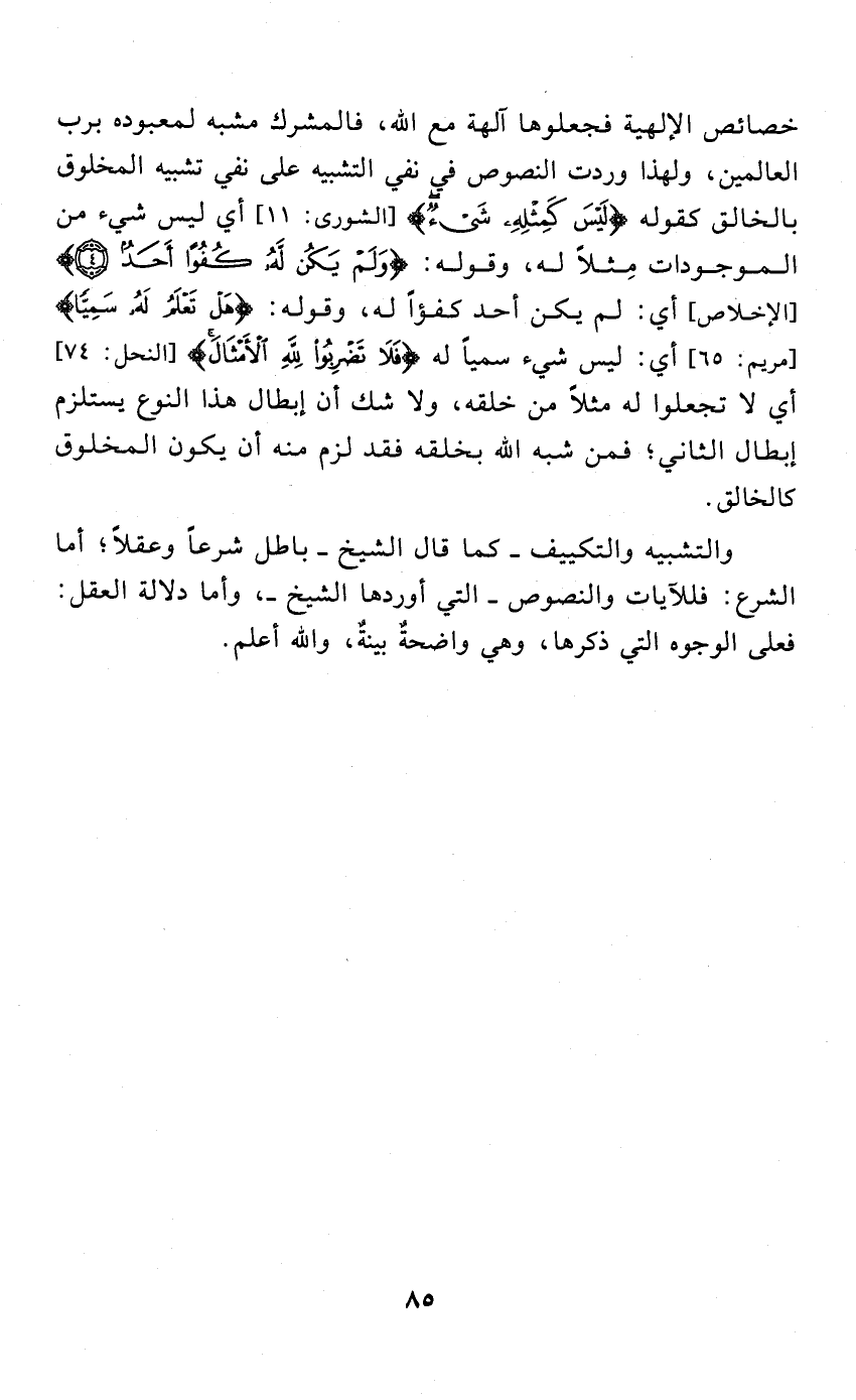 خصائص الإلهية فجعلوها آلهة مع الله , فالمشرك مشبه لمعبوده برب العالمين , ولهذا وردت النصوص في نفي التشبيه على نفي تشبيه المخلوق بالخالق كقوله " ليس كمثله شيء " [الشورى: 11] أي ليس شيء من الموجودات مِثلًا له , وقوله: " ولم يكن له كفوًا أحد " [الإخلاص] أي: لم يكن أحد كفؤًا له , وقوله: " هل تعلم له سميًا " أي: ليس شيء سميًا له " فلا تضربوا لله الأمثال " [النحل: 74] أي لا تجعلوا له مثلا من خلقه , ولا شك أن إبطال هذا النوع يستلزم إبطال الثاني؛ فمن شبه الله بخلقه فقد لزم منه أن يكون المخلوق كالخالق.