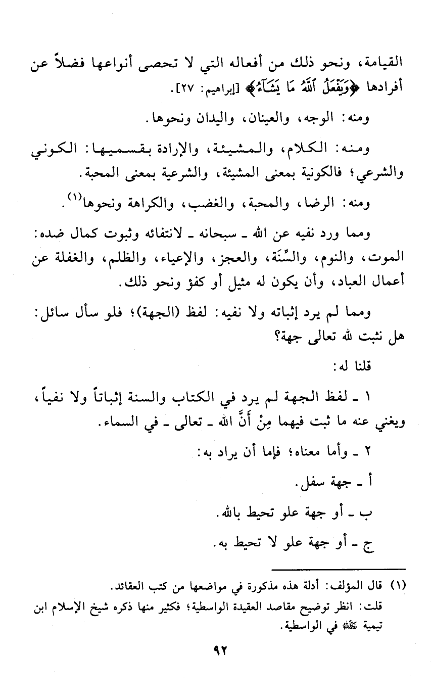 ومما لم يرد إثباته ولا نفيه: لفظ (الجهة)؛ فلو سأل سائل: هل نثبت لله تعالى جهة؟