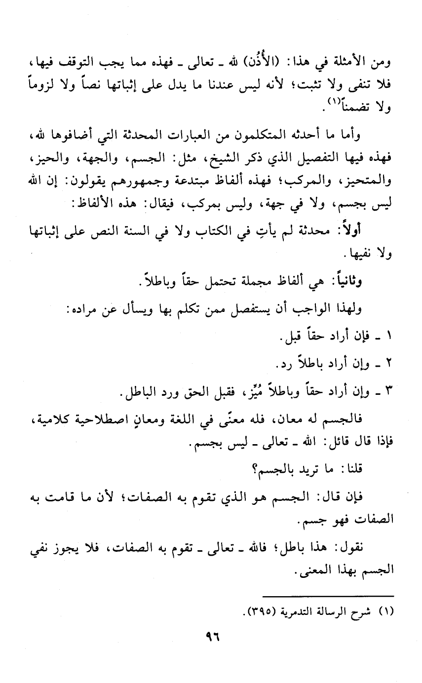 وأما ما أحدثه المتكلمون من العبارات المحدثة التي أضافوها لله , فهذه فيها التفصيل الذي ذكر الشيخ , مثل: الجسم، والجهة، والحيز، والمتحيز، والمركب؛ فهذه ألفاظ مبتدعة وجمهورهم يقولون: إن الله ليس بجسم، ولا في جهة، وليس بمركب , فيقال: هذه الألفاظ:
