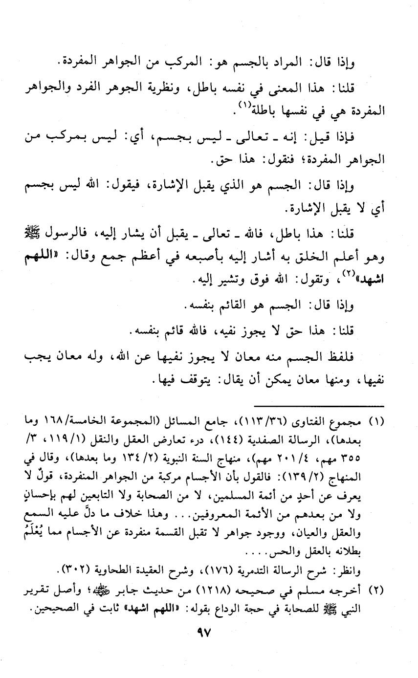 (¬1) مجموع الفتاوى (36/ 113)، جامع المسائل (المجموعة الخامسة / 168 وما بعدها)، الرسالة الصفدية (144)، درء تعارض العقل والنقل (1/ 119، 3/ 355 مهم، 4/ 201 مهم)، منهاج السنة النبوية (2/ 134 وما بعدها)، وقال في المنهاج (2/ 139): فالقول بأن الأجسام مركبة من الجواهر المنفردة، قولٌ لا يعرف عن أحدٍ من أئمة المسلمين، لا من الصحابة ولا التابعين لهم بإحسانٍ ولا من بعدهم من الأئمة المعروفين ... وهذا خلاف ما دلَّ عليه السمع والعقل والعيان، ووحود جواهر لا تقبل القسمة منفردة عن الأجسام مما يُعْلَمُ بطلانه بالعقل والحس ... .