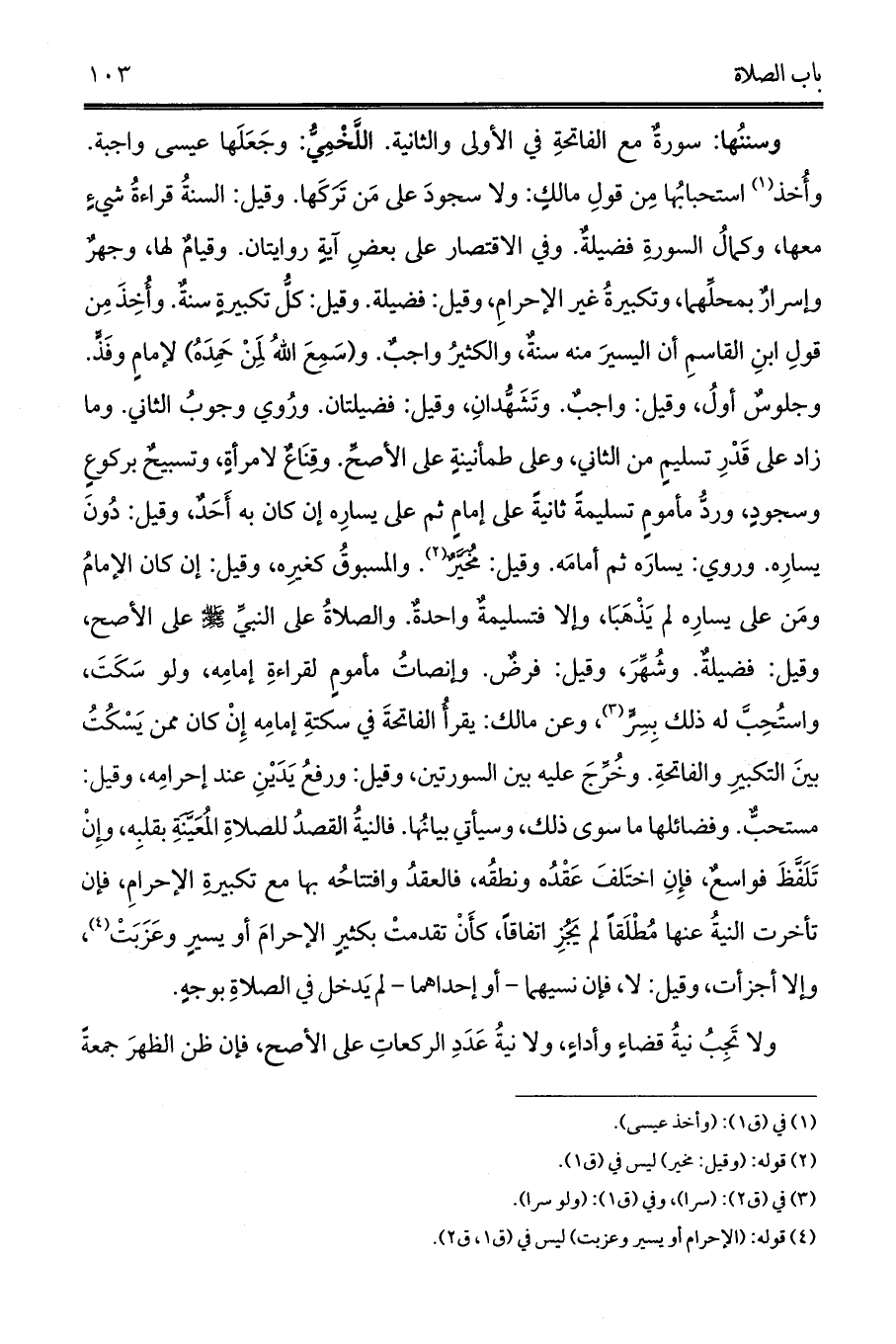 وسننُها: سورةٌ مع الفاتحةِ في الأولى والثانية. اللَّخْمِيُّ: وجَعَلَها عيسى واجبة. وأُخذ (¬1) استحبابُها مِن قولِ مالكٍ: ولا سجودَ على مَن تَرَكَها. وقيل: السنةُ قراءةُ شيءٍ معها، وكمالُ السورةِ فضيلةٌ. وفي الاقتصار على بعضِ آيةٍ روايتان. وقيامٌ لها، وجهرٌ وإسرارٌ بمحلِّهما، وتكبيرةُ غير الإحرامِ، وقيل: فضيلة. وقيل: كلُّ تكبيرةٍ سنةٌ. وأُخِذَ مِن قولِ ابنِ القاسمِ أن اليسيرَ منه سنةٌ، والكثيرُ واجبٌ. و (سَمِعَ اللهُ لِمَنْ حَمِدَهُ) لإمامٍ وفَذٍّ. وجلوسٌ أولُ، وقيل: واجبٌ. وتَشَهُّدانِ، وقيل: فضيلتان. ورُوي وجوبُ الثاني. وما زاد على قَدْرِ تسليمٍ من الثاني، وعلى طمأنينةٍ على الأصحِّ. وقِنَاعٌ لامرأةٍ، وتسبيحٌ بركوعٍ وسجودٍ، وردُّ مأمومٍ تسليمةً ثانيةً على إمامٍ ثم على يسارِه إن كان به أَحَدٌ، وقيل: دُونَ يسارِه. وروي: يسارَه ثم أمامَه. وقيل: مُخَيَّرٌ (¬2). والمسبوقُ كغيرِه، وقيل: إن كان الإمامُ ومَن على يسارِه لم يَذْهَبَا، وإلا فتسليمةٌ واحدةٌ. والصلاةُ على النبيِّ - صلى الله عليه وسلم - على الأصح، وقيل: فضيلةٌ. وشُهِّرَ، وقيل: فرضٌ. وإنصاتُ مأمومٍ لقراءةِ إمامِه، ولو سَكَتَ، واستُحِبَّ له ذلك بِسِرٍّ (¬3)، وعن مالك: يقرأُ الفاتحةَ في سكتةِ إمامِه إِنْ كان ممن يَسْكُتُ بينَ التكبيرِ والفاتحةِ. وخُرِّجَ عليه بين السورتين، وقيل: ورفعُ يَدَيْنِ عند إحرامِه، وقيل: مستحبٌّ. وفضائلها ما سوى ذلك، وسيأتي بيانُها.