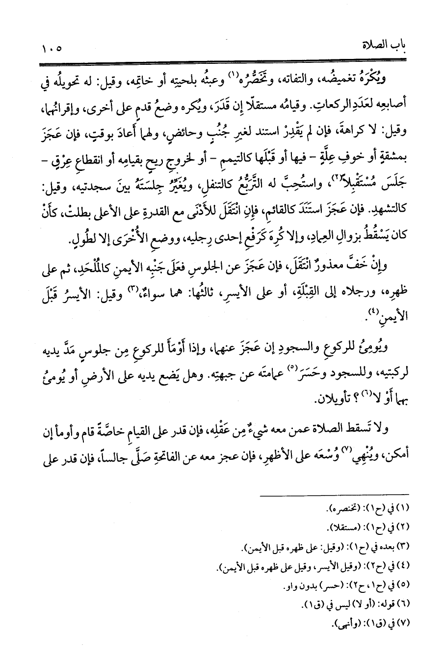ويُكْرَهُ تغميضُه، والتفاته، وتَخَصُّرُه (¬1) وعبثُه بلحيتِه أو خاتِمه، وقيل: له تحويلُه في أصابعِه لعَدَدِ الركعاتِ. وقيامُه مستقلّا إِن قَدَرَ، ويُكره وضعُ قدمٍ على أخرى، وإقرانُهما، وقيل: لا كراهةَ، فإن لم يَقْدِرْ استند لغيرِ جُنُبٍ وحائضٍ، ولهما أَعادَ بوقتٍ، فإن عَجَزَ بمشقةٍ أو خوفِ عِلَّةٍ - فيها أو قَبْلَها كالتيممِ - أو لخروجِ ريحٍ بقيامِه أو انقطاعِ عِرْقٍ - جَلَسَ مُسْتَقْبِلاً (¬2)، واستُحِبَّ له التَّرَبُّعُ كالتنفلِ، ويُغَيِّرُ جِلسَتَهُ بينَ سجدتيه، وقيل: كالتشهدِ. فإن عَجَزَ استَنَدَ كالقائمِ، فإِنِ انْتَقَلَ للأَدْنَى مع القدرةِ على الأعلى بطلتْ، كأَنْ كان يَسْقُطُ بزوالِ العِمادِ، وإلا كُرِهَ كَرَفْعِ إحدى رِجليه، ووضعِ الأُخْرَى إلا لطُولٍ.