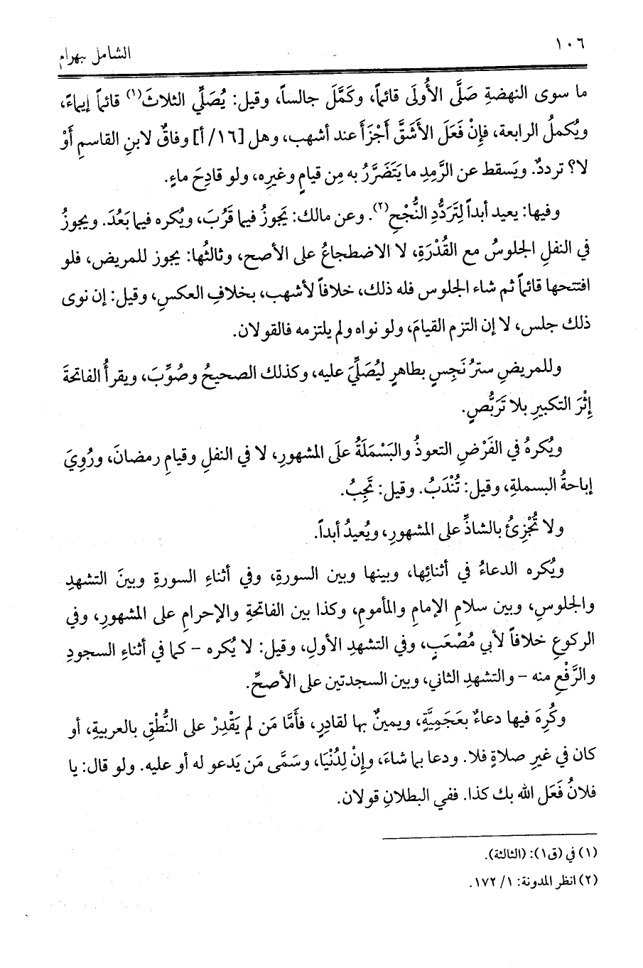 وفيها: يعيد أبداً لِتَرَدُّدِ النُّجْحِ (¬2). وعن مالك: يَجوزُ فيما قَرُبَ، ويُكره فيما بَعُدَ. ويجوزُ في النفلِ الجلوسُ مع القُدْرَةِ، لا الاضطجاعُ على الأصح، وثالثُها: يجوز للمريض، فلو افتتحها قائماً ثم شاء الجلوس فله ذلك، خلافاً لأشهب، بخلافِ العكسِ، وقيل: إن نوى ذلك جلس، لا إن التزم القيامَ، ولو نواه ولم يلتزمه فالقولان.