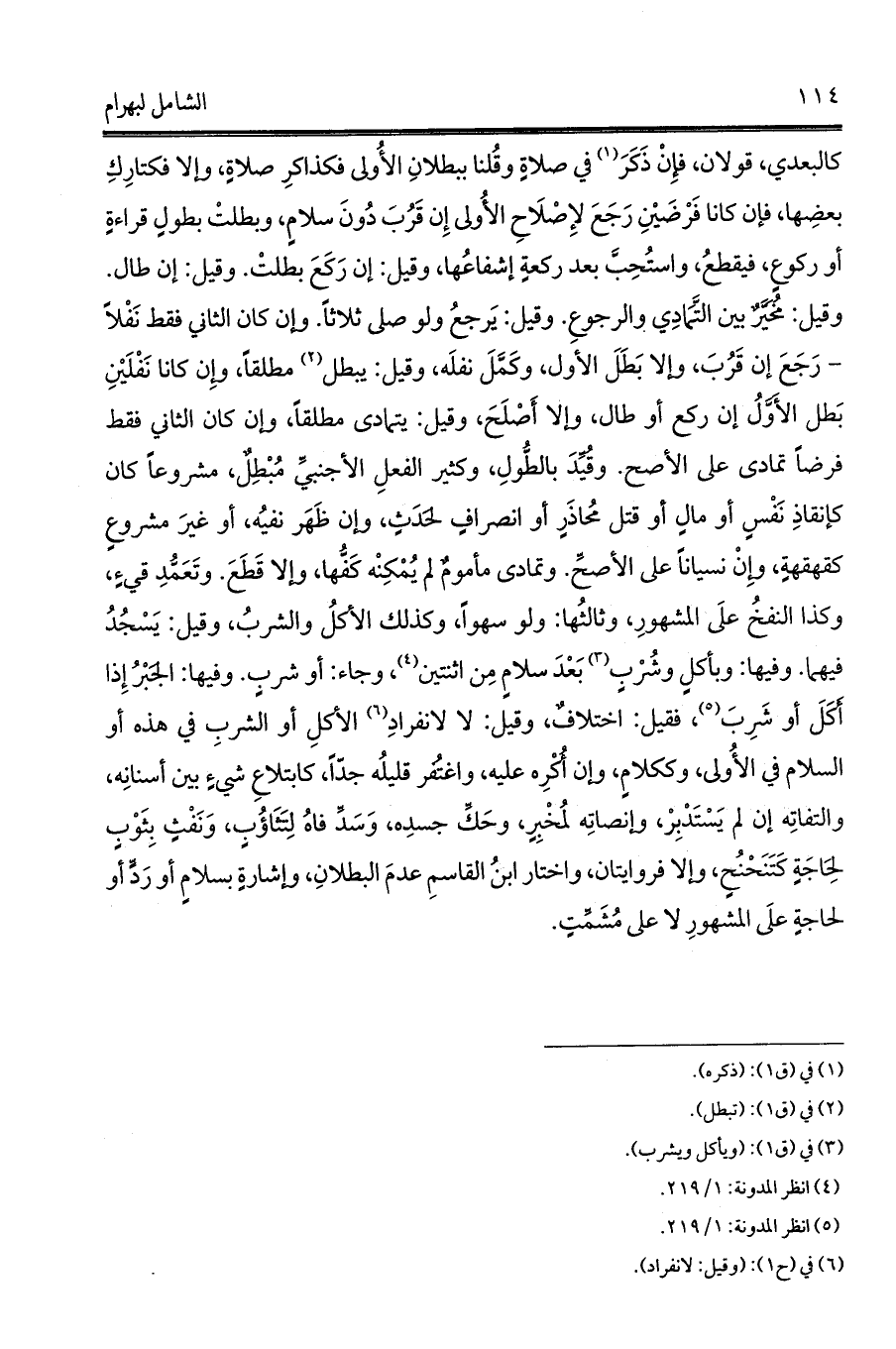 وفيها: الجَبْرُ إِذا أَكَلَ أو شَرِبَ (¬5)، فقيل: اختلافٌ، وقيل: لا لانفرادِ (¬6) الأكلِ أو الشربِ في هذه أو السلام في الأُولى، وككلامٍ، وإن أُكْرِه عليه، واغتُفر قليلُه جدّاً، كابتلاعِ شيءٍ بين أسنانِه، والتفاتِه إن لم يَسْتَدْبِرْ، وإنصاتِه لمُخْبِرٍ، وحَكِّ جسدِه، وَسَدِّ فاهُ لِتَثَاؤُبٍ، وَنَفْثٍ بِثَوْبٍ لِحَاجَةٍ كَتَنَحْنُحٍ، وإلا فروايتان، واختار ابنُ القاسمِ عدمَ البطلانِ، وإشارةٍ بسلامٍ أو رَدٍّ أو لحاجةٍ علَى المشهورِ لا على مُشَمِّتٍ.