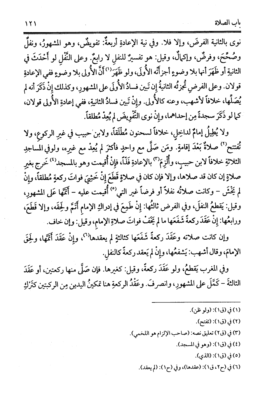 نوى بالثانية الفرضَ، وإلا فلا. وفي نية الإعادةِ أربعةٌ: تفويضٌ، وهو المشهورُ، ونفلٌ وصُحِّحَ، وفرضٌ، وإكمالٌ، وقيل: هو تفسيرٌ للنفلِ لا رابعٌ. وعلى النَّفْلِ لو أَحْدَثَ في الثانيةِ أو ظَهَرَ أنها بلا وضوءٍ أجزأَتْه الأُولَى، ولو ظَهَرَ (¬1) أَنَّ الأُولى بلا وضوءٍ ففي الإعادةِ قولان. وعلى الفرضِ تُجزئُه الثانيةُ إِن تَبين فسادُ الأُولَى على المشهورِ، وكذلك إِنْ ذَكَرَ أنه لم يُصَلِّها، خلافاً لأشهب، وعنه كالأُولى. وإِنْ تَبين فسادُ الثانيةِ، ففي إعادةِ الأُولى قولان، كما لو ذَكَرَ سجدةً مِن إحداهما، وإِنْ نوى التَّفْوِيضَ لم يُعِدْ مُطلقاً.